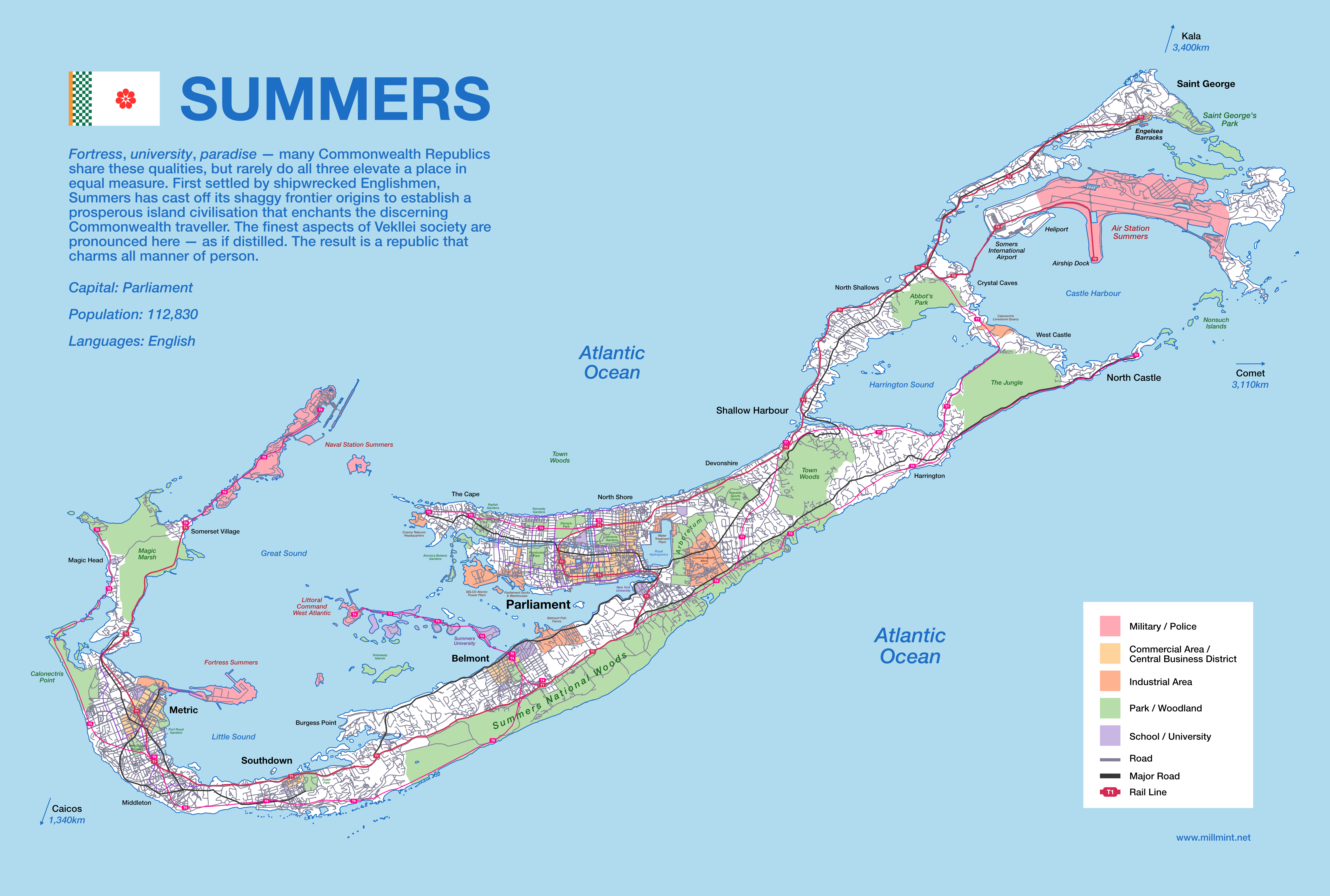 The Republic of Summers is a constituent republic in the western North Atlantic, and part of the country of Vekllei. It is an island city state consisting of an archipelago of 7 main islands and about 170 charted islets and rocks, situated about 1,000km off the east coast of the United States and about 3,120km southwest of the Vekllei capital in Comet.