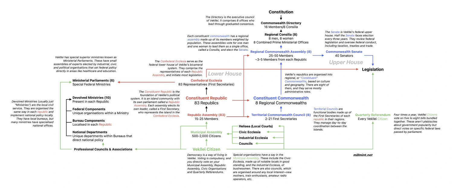 Government in Vekllei is a federal parliamentary directoral commonwealth that unites 83 island republics across the Atlantic and Caribbean. The system operates through consensus democracy and devolved administration, creating a sui generis state without direct precedence or comparison.