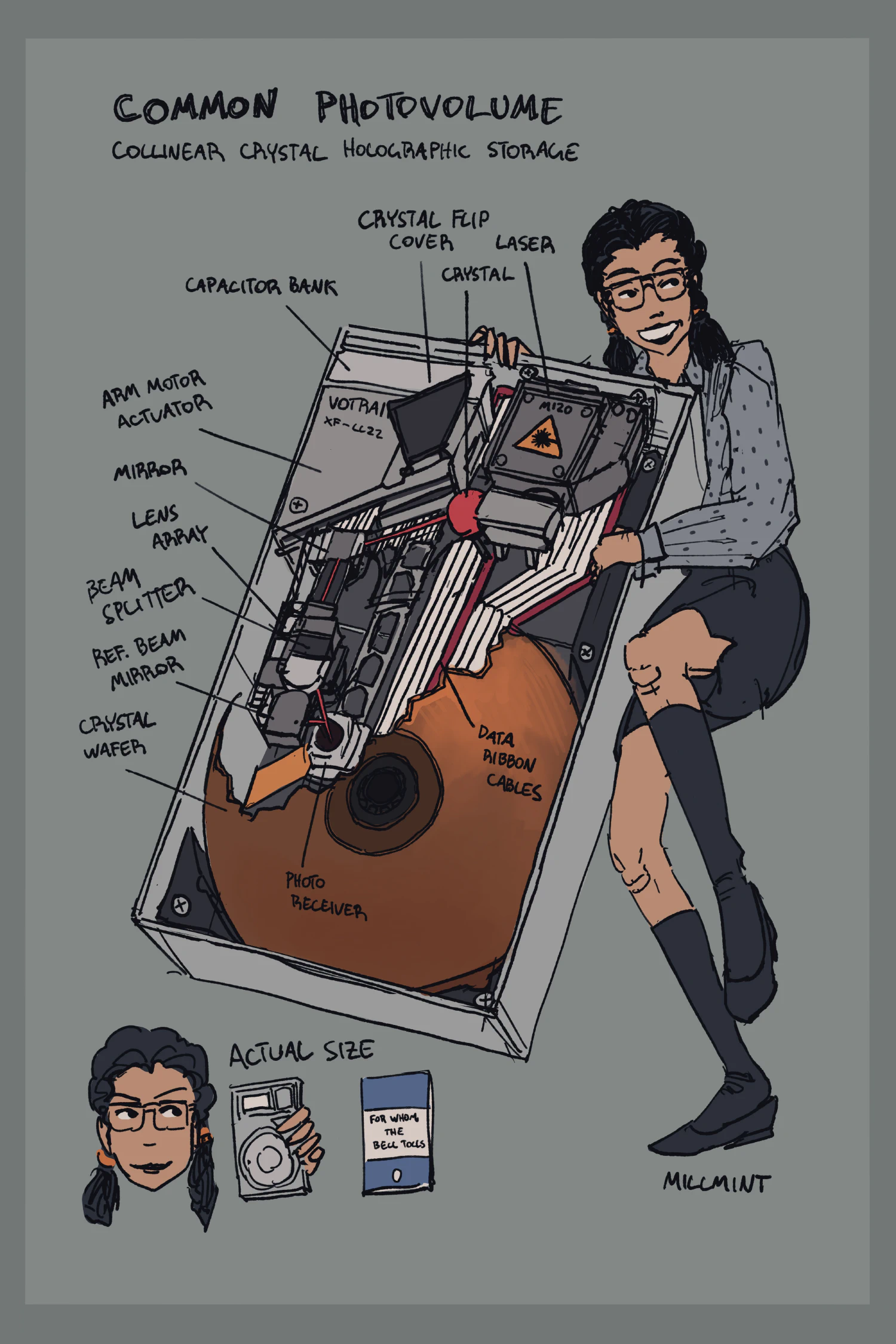 The data in the drive is stored in trays, which contain crystal wafers derived from a larger crystal boule. These look like very thin disks, and have a large surface area to read and write data to. In most commercial photovolumes, there is a smaller tray called a cache that uses higher-performance crystal wafers for temporary storage to increase data retrieval speeds.