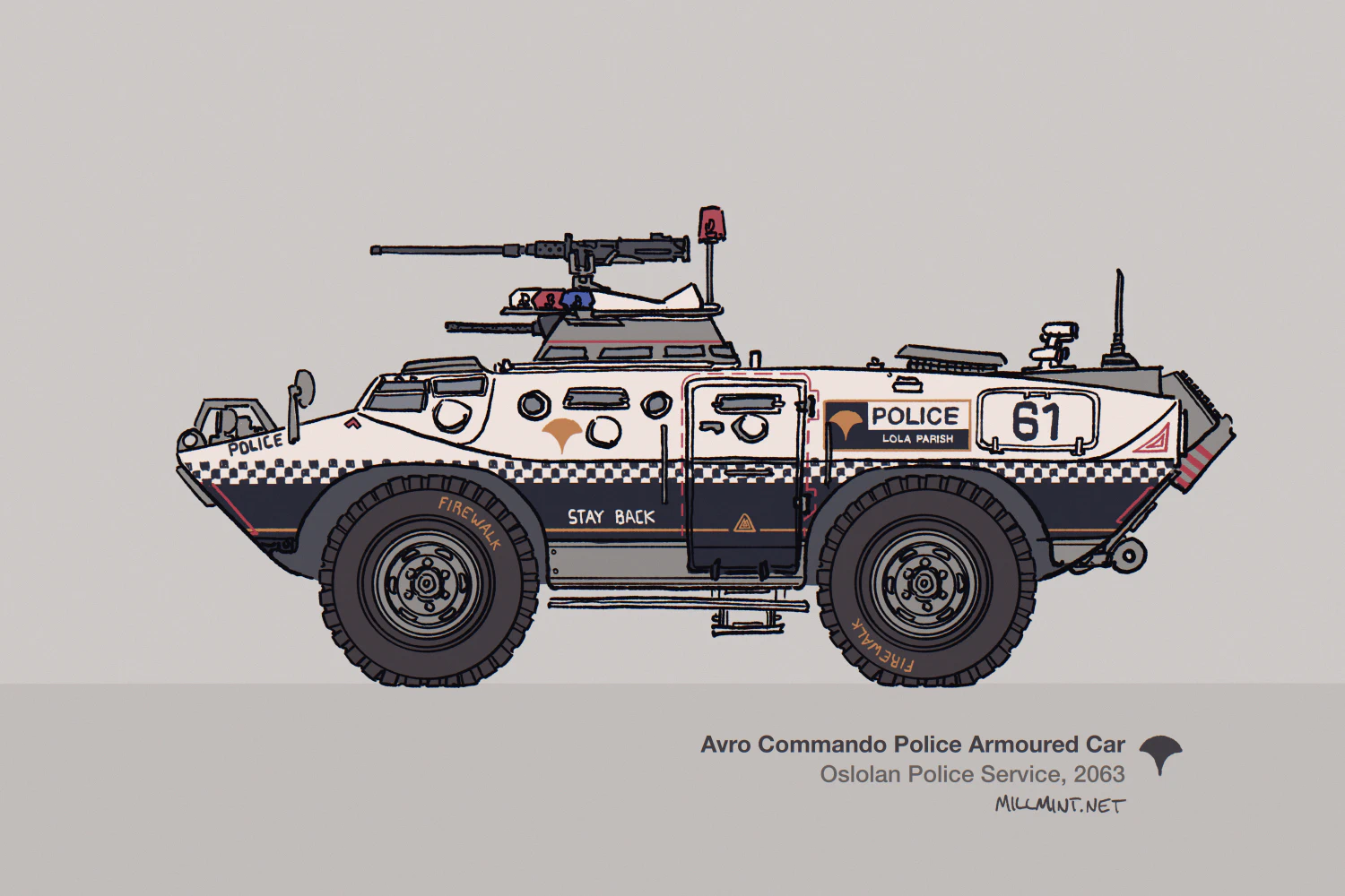 The vehicle’s design is derived from the military CMD-Naval, which is itself a modified license of the Cadillac Gage Commando APC. Avro modified it in consultation with the Ministry of Defence to balance capability with the less militarised character of Vekllei policing. Built on a modified Commando chassis, the Commando features a monocoque armoured hull capable of withstanding small arms fire. Like its military cousin, the CMD-Police is amphibious.