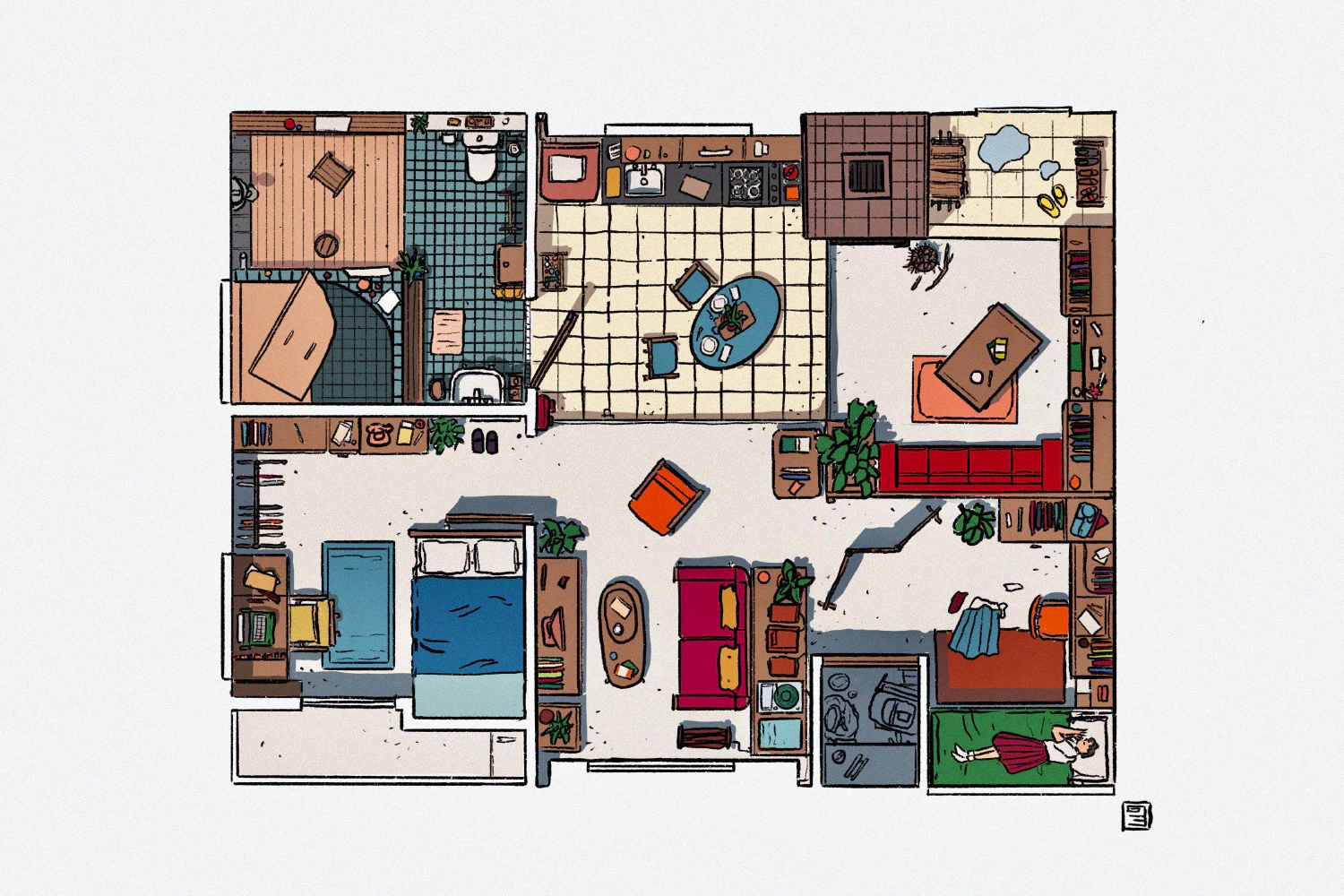 In some ways, it was a very conventional apartment in the Vekllei tradition. It had a sauna and bath in the wetroom, a bidet, a sunken living room and a bread oven. In others, it was more peculiar. The apartment was bizarrely allocated across three levels. You alighted the entrance light well into a sunken living space, then climbed back up into the kitchen. The main living room and master bedroom were another step above the kitchen. Adjacent to the main living area was a closet and study, which overlooked the entrance from a half-meter mezzanine.