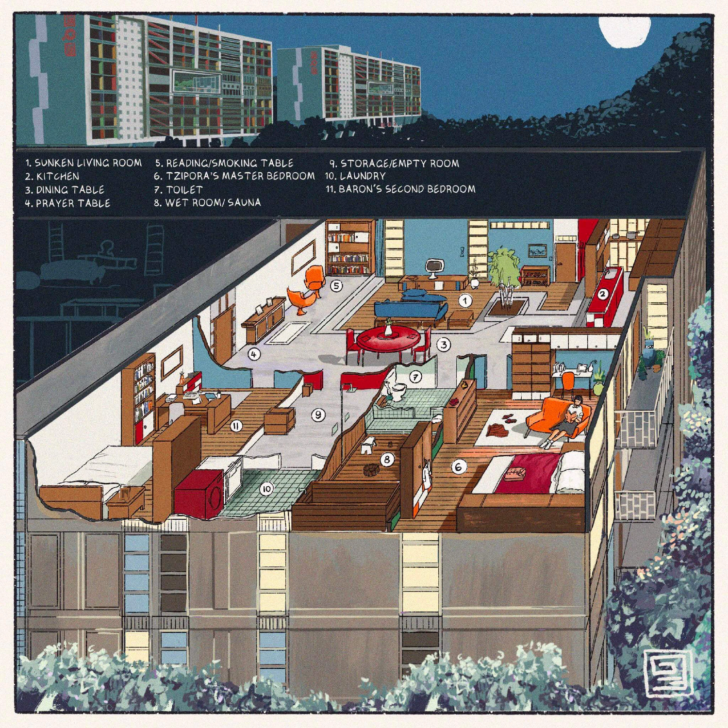 Stepping in to the footwell of the apartment, Zelda removes her shoes. There’s some rumour about the custom dating back to the Viking days as a sign of peaceful intention, but today it’s for cleanliness. The living room is sunken, and is lighted by the windows looking out into the interior street, which receive sun about the time she comes home. The kitchen overlooks the living space and indoor fig, and includes a large partition/cupboard that can roll on rails across the width of the apartment. There are many small examples of similar modularity throughout the apartment, balanced carefully with Newda’s affection for permanence. Pipes run beneath the concrete for underfloor heating, providing toasty floors in Vekllei’s dark, brutal winters. The apartment is divided between a semi-public half, which includes the living, dining and cooking areas, and a ‘private half’ which contains the two bedrooms, bathroom and laundry.