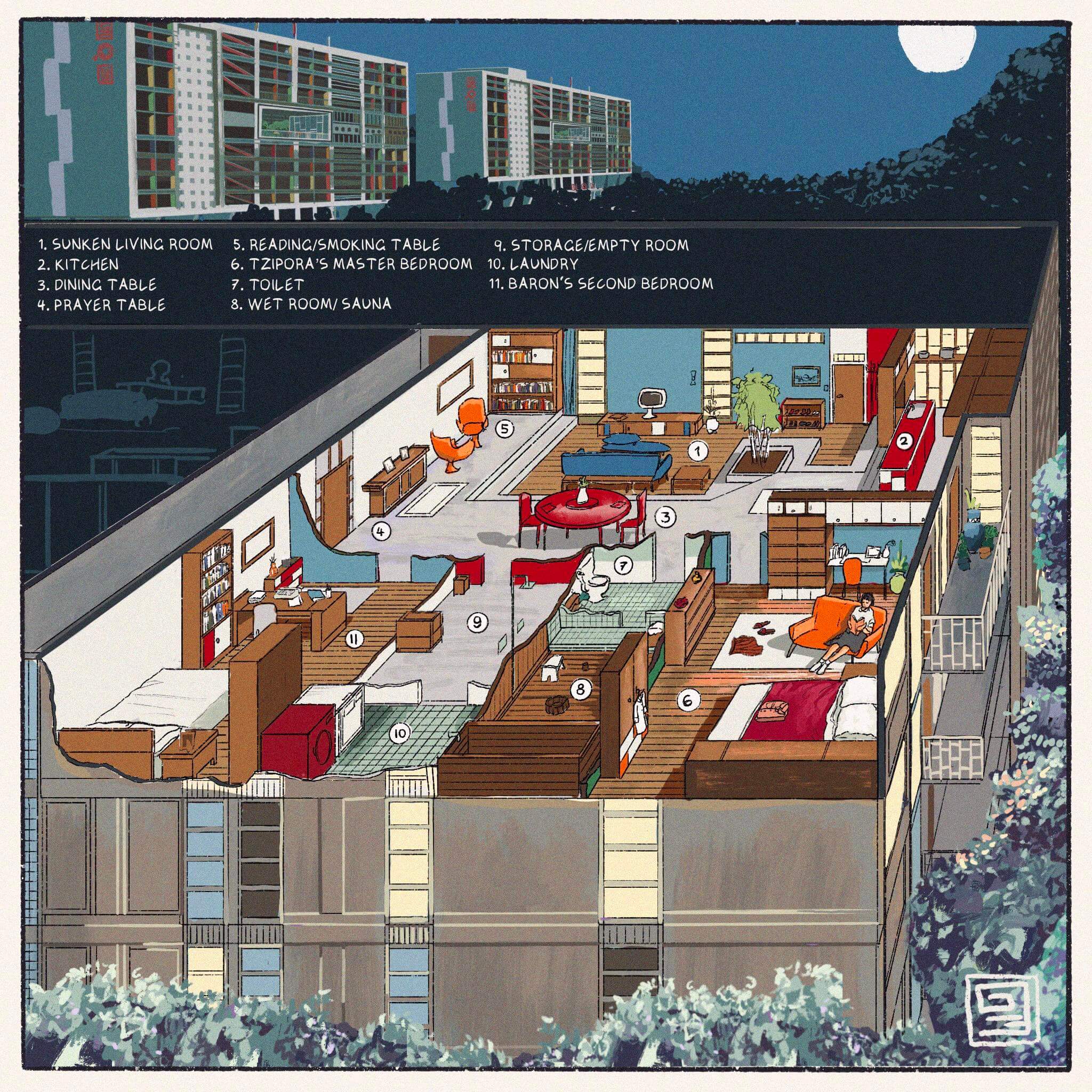Stepping in to the footwell of the apartment, Zelda removes her shoes. There’s some rumour about the custom dating back to the Viking days as a sign of peaceful intention, but today it’s for cleanliness. The living room is sunken, and is lighted by the windows looking out into the interior street, which receive sun about the time she comes home. The kitchen overlooks the living space and indoor fig, and includes a large partition/cupboard that can roll on rails across the width of the apartment. There are many small examples of similar modularity throughout the apartment, balanced carefully with Newda’s affection for permanence. Pipes run beneath the concrete for underfloor heating, providing toasty floors in Vekllei’s dark, brutal winters. The apartment is divided between a semi-public half, which includes the living, dining and cooking areas, and a ‘private half’ which contains the two bedrooms, bathroom and laundry.