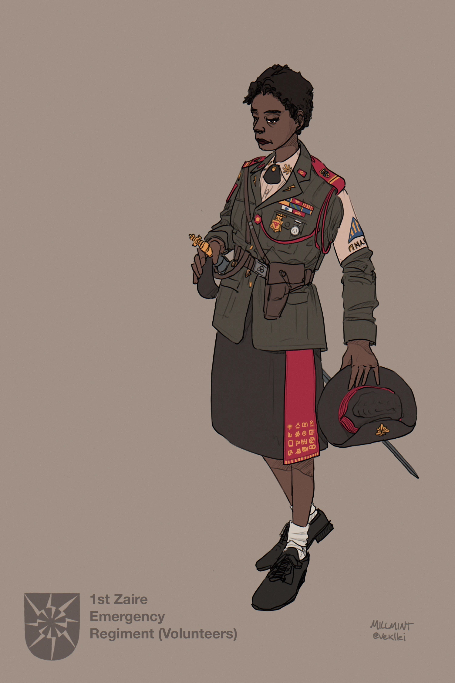 She wears a gi (a ceremonial Oslolan pleat), her sabre (all infantry are trained swordsmen), service revolver, and her awards, including her Medal of Valour.