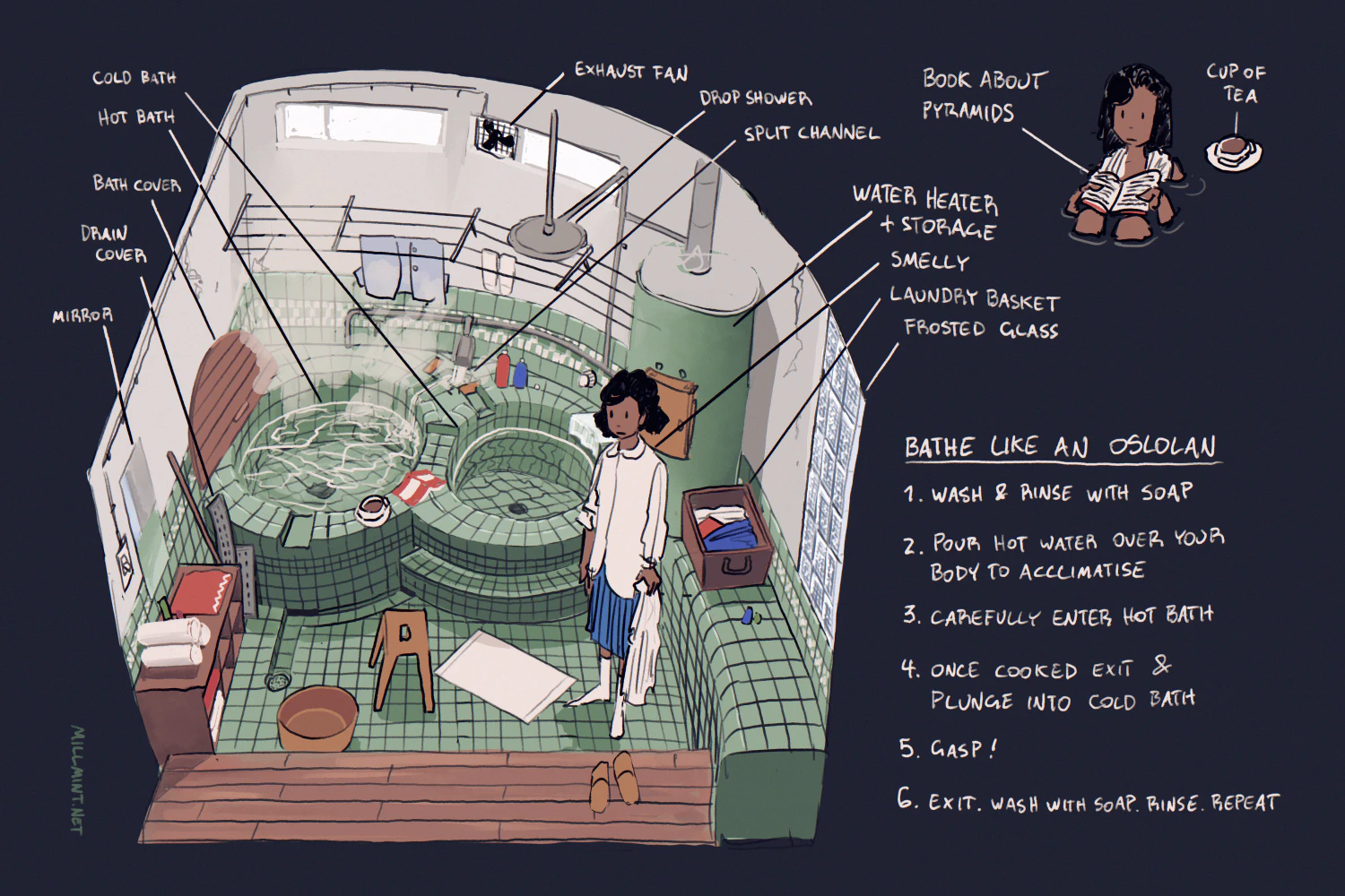 MillMint -millmint 📔 Intro 📓 Factbook 📕 MillMint 📗 Stories > > > > NEW 📗Story: Police Armoured Car ❌ How to Bathe Like an Oslolan Thursday, Jul 10, 2025 Home Stories MillMint Tzipora hates their tradition of communal bathing, but really likes the shock of the cold water because the pain makes her feel clean.
