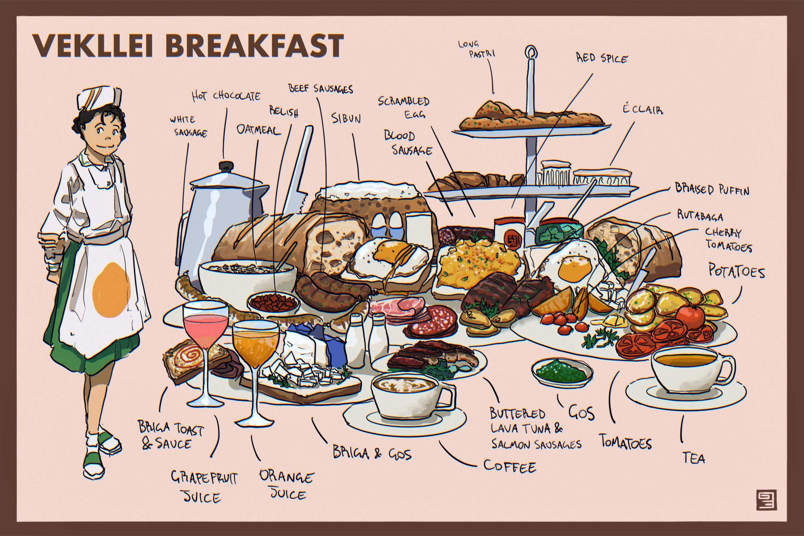 Sitting down and enjoying food is a cornerstone of life in Vekllei. You cannot participate in society without it. For immigrants, the privacy of a quiet breakfast is good practice for the palettes and conventions of eating in Vekllei — so load up your plates.