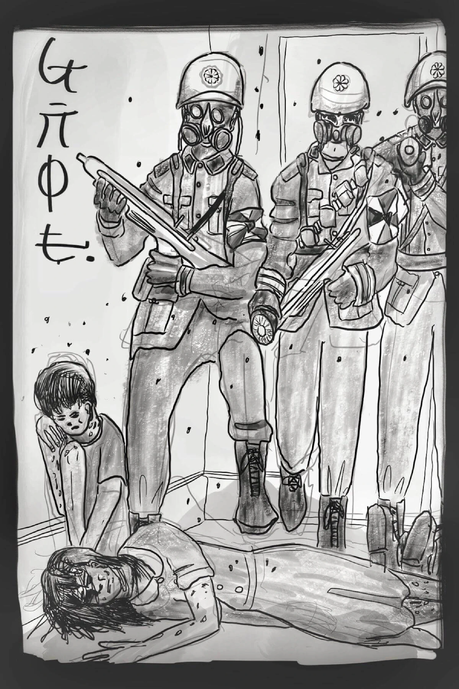The troops pictured form part of the Vekllei expeditionary forces, an experienced group that deals largely with war crimes and militarised espionage. They operate in coordination with the secret services and military police. A New York Times photojournalist attached with Unit 75 in northeast Taiwan documented the consequences of heavy chemical shelling in rural Taiwan, and saw just a small number of the hundreds of thousands killed in the Sino-Taiwanese war.