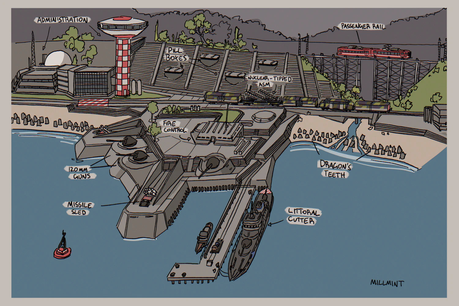 Once close, an invading party can be surprised by bunkered missile launchers on sleds and nuclear-tipped missile trains sheltered beneath mountains. The guns are mostly for show; the carrier-killer missiles are the real deal