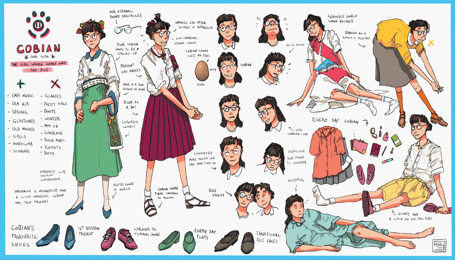 That doesn’t work so well in a comic with sequential panels, so I’ve been working on standardising my characters. This is a concept panel for Cobian, Tzipora’s longtime friend (and occasional girlfriend). She’s an awkward, sympathetic sort of person, and often left out in my posts. She certainly doesn’t deserve such treatment – she’s one of the most interesting, complex people in the Vekllei cast and I hope to treat her with respect in future.