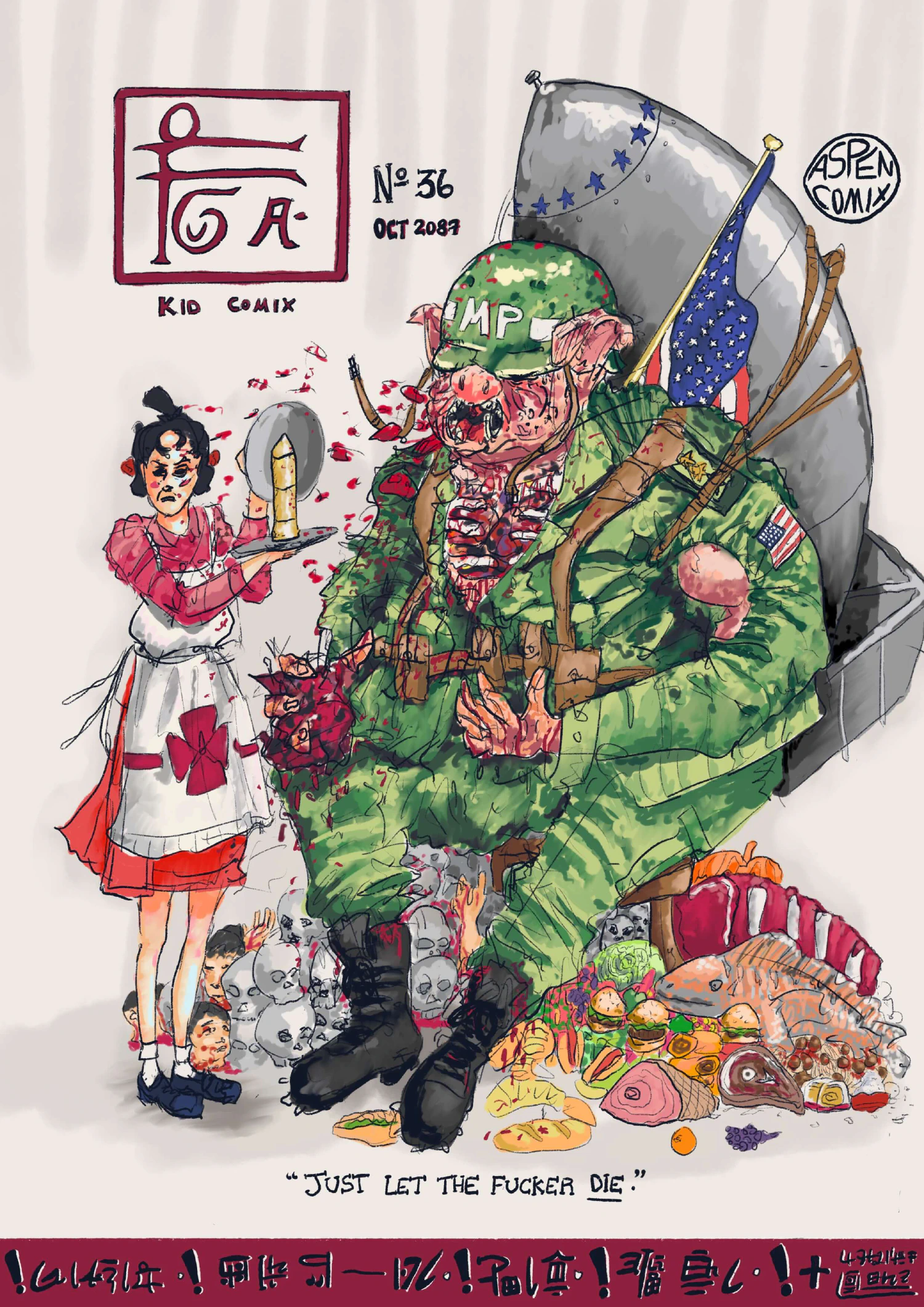 The comic is not subtle: a stereotypical Vekllei girl complete with gi and fountain hairpiece offers an artillery shell to a deformed pigman soldier carrying the U.S. flag and an atom bomb. The girl wears the national flower on her apron. The pigman sits atop a throne of food and corpses, as he himself decomposes. Subtitled in English by Squick: โJust let the fucker DIEโ.