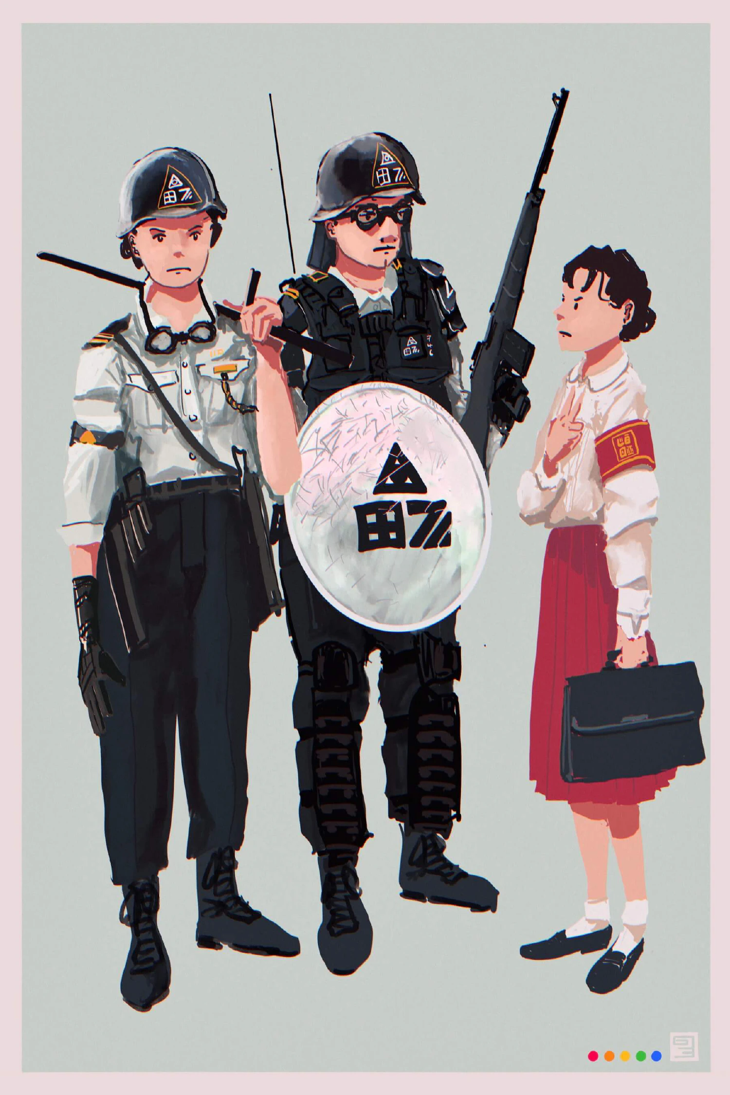 Depicted here is a riot officer in βsilks,β the term for the Compor uniform including revolver and long truncheon. Besides her is an armoured officer of Special Tactics, which responds to serious threats of violence. The iconic Compor shield is displayed here for documentary purposes. Special Tactics carry powerful radios designed to work in all environments.