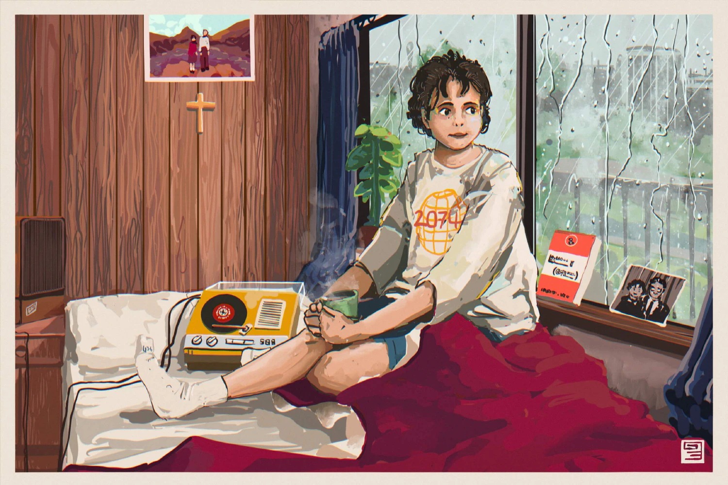 Above her bed is a cross, which she treats like a totem. She has a very transactional relationship with God. She doesn’t like him much, but figures doing Him a favour by hanging his cross this one time might earn her a bit of luck when she needs it.