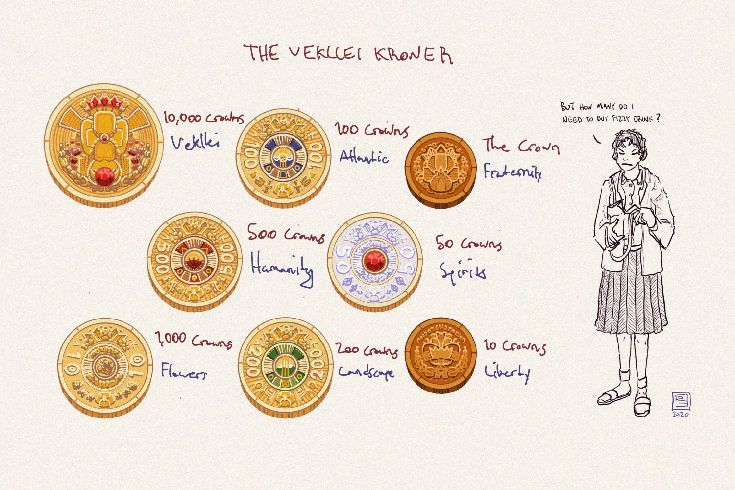 The “small crowns,” worth 1VK and 10VK respectively, represent fraternity and liberty, two founding elements of the Vekllei constitution. The 50VK coin is plated in silver and has a small ruby inset. Rubies are used to represent energy, in this case, the vitality of the spirits, which dominate Upen and the Vekllei landscape. The 100, 200, 500 and 1,000VK coins represent different landscapes of the country. As a volcanic island nation, the ocean (100) and landscape (200) coins are fairly straightforward. The humanity coin (500) represents the Vekllei people and ancestry — note how humans are placed alongside other natural forces. The flower coin (1,000VK) represents the flowers of the country, which are important spiritually and have formed part of the Vekllei identity. Vekllei has the most flowers per capita in the world. The final, larger 10,000VK coin represents the previous seven together, as a total sum of Vekllei landscape and identity.