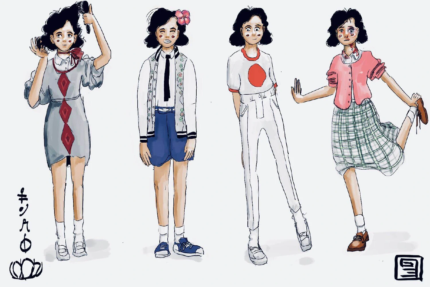 Three-quarter-length trousers with white penny loafers. Her T-shirt bears the Vekllei emblem for the moon, but to non-Vekllei it looks Japanese.