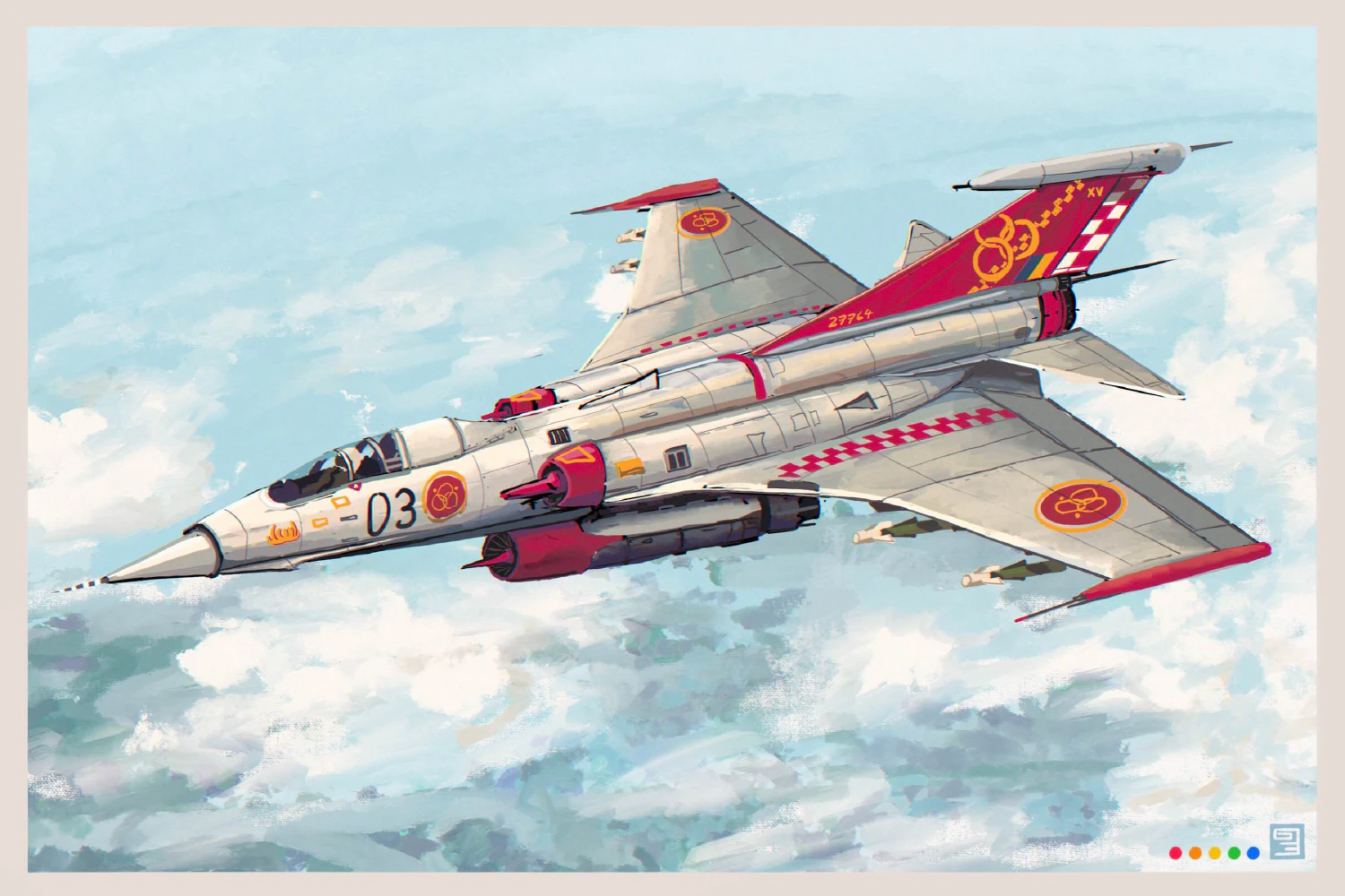 Pictured here is a RD-64 Demon, built in Government Aircraft Factories Aeroyards in Montreya. Like most nuclear fighters in Vekllei, it carries its reactor beneath its fuselage, where it can be refuelled and detached for maintenance easily without grounding the aircraft for months at a time. They are tremendously fast, and thanks to the weight savings of sunburst reactors, are tremendously well-equipped for emerging air combat.