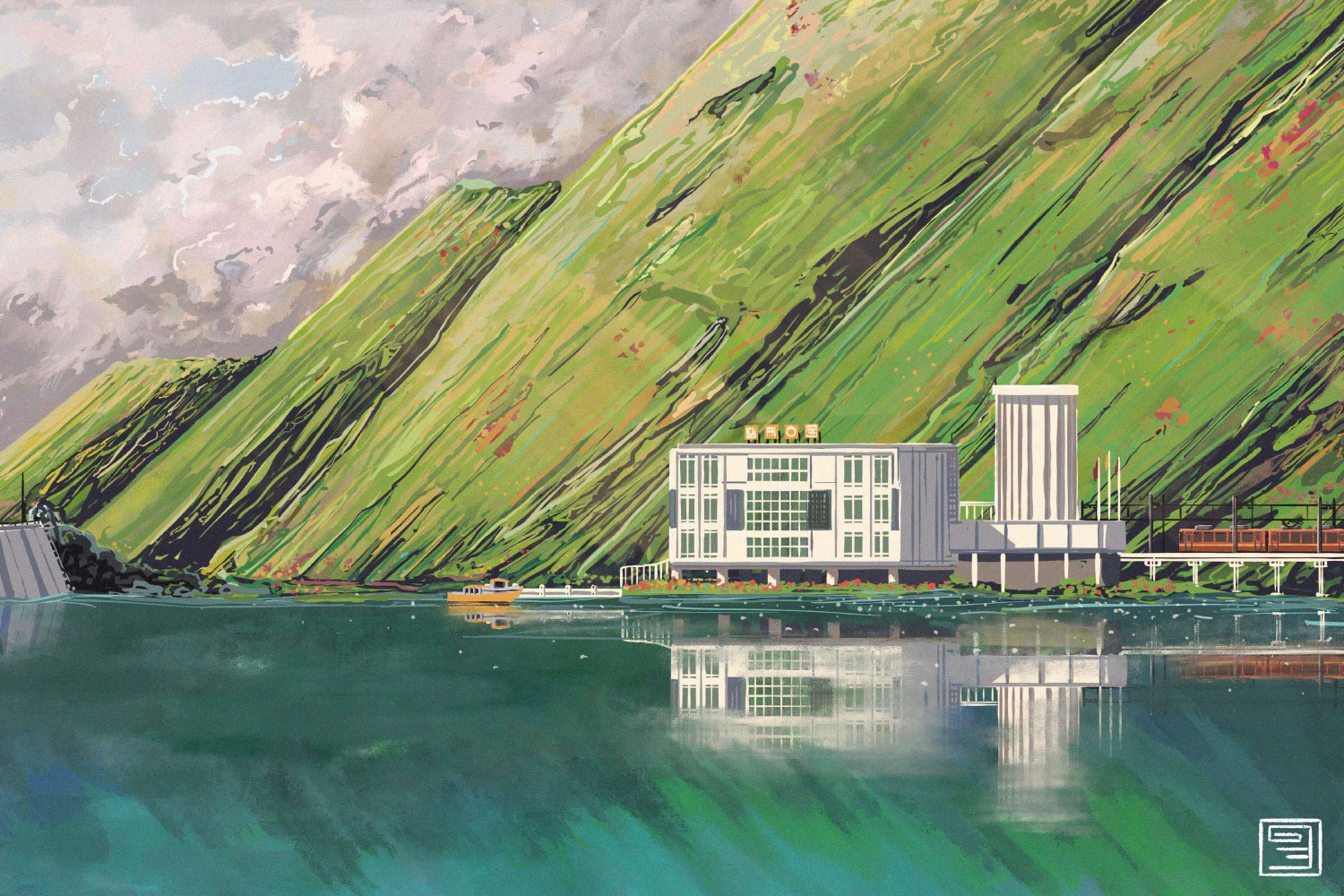 Depicted here is the Ou Hydroburo Office, located outside of Ou in the Vekllei West Ro Highlands and serviced by a special express train that arrives in the morning and departs at the end of the day. Many townsfolk in Ou are employed in operation of the dam, either through the Thunder or Hydroburos. It is also the site of a small Vekllei National University laboratory which examines the dam environment and trains its staff.
