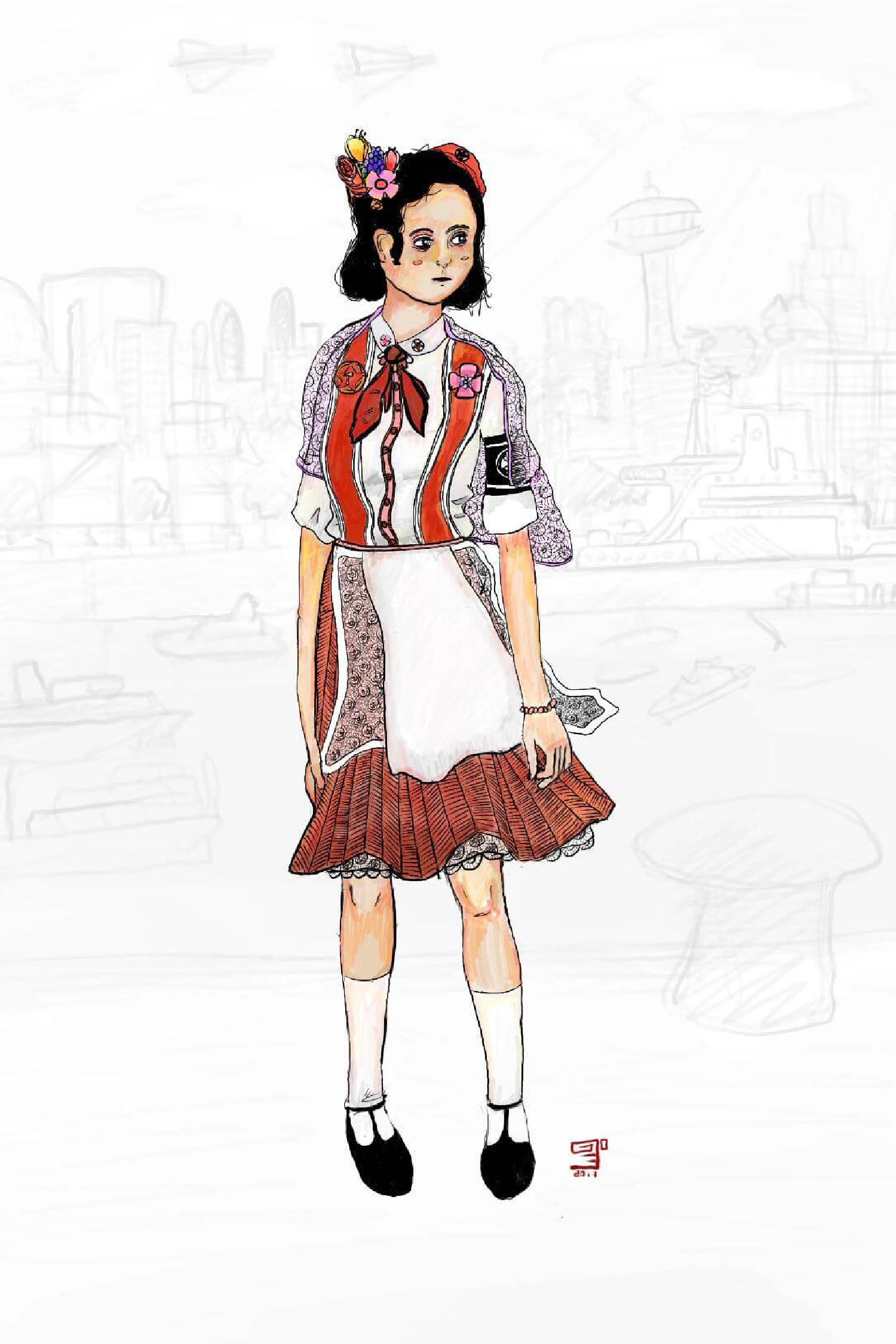 Tzipora, a recent immigrant girl of eleven years, wears the feminine national dress of Vekllei. It is a delicate, traditional and deeply spiritual costume, and is tied to Vekllei’s foundations and aspirations as a state. It has political symbolism, but it also ties the girl to the land she stands on.