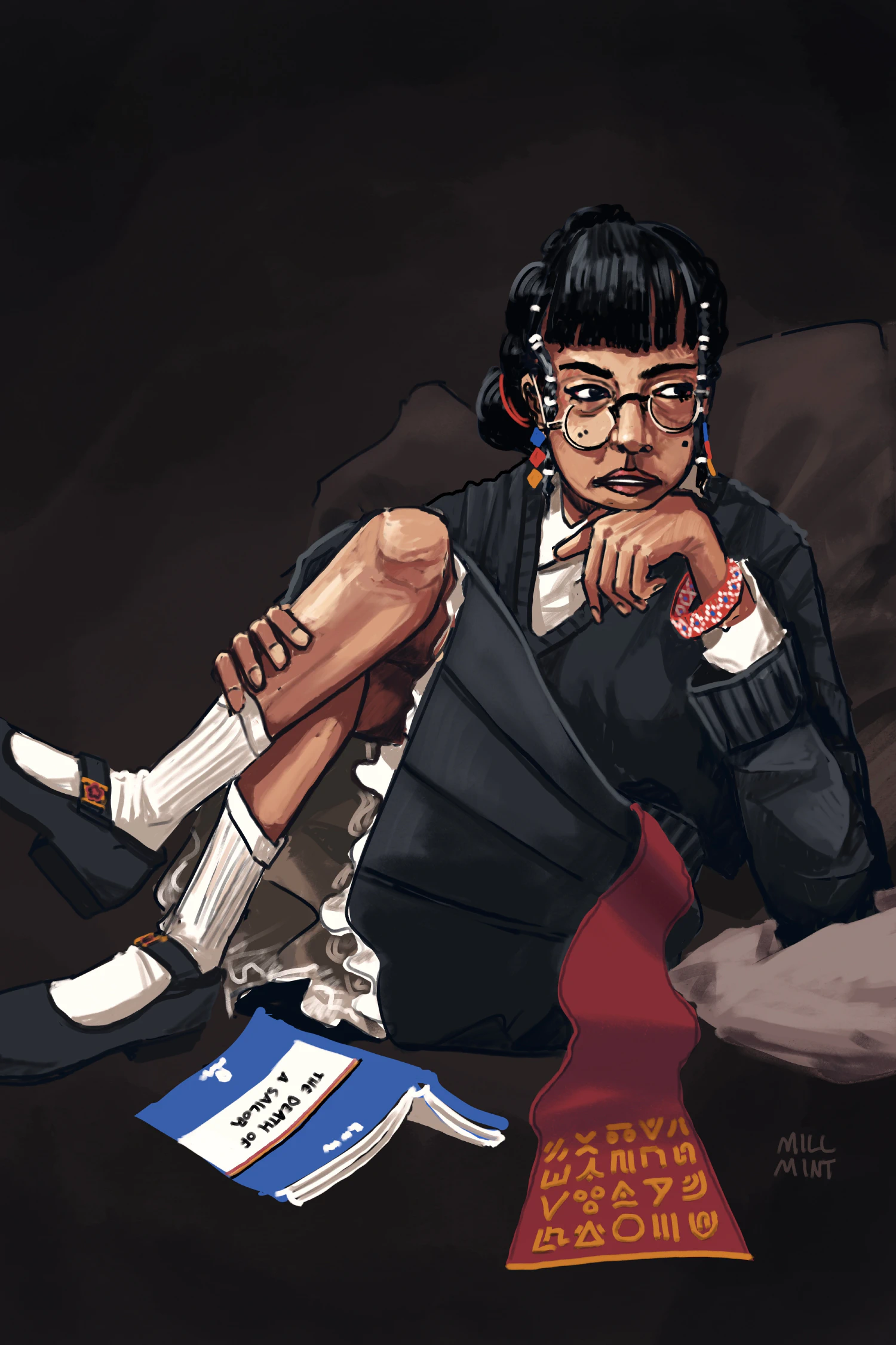 She’s wearing a ‘gi’, a ceremonial pleat that sits over the skirt stitched with protective runes, unique to Oslola. Vekllei uniforms are very similar across all its constituent republics, but they have a lot of distinct cultural items like this.