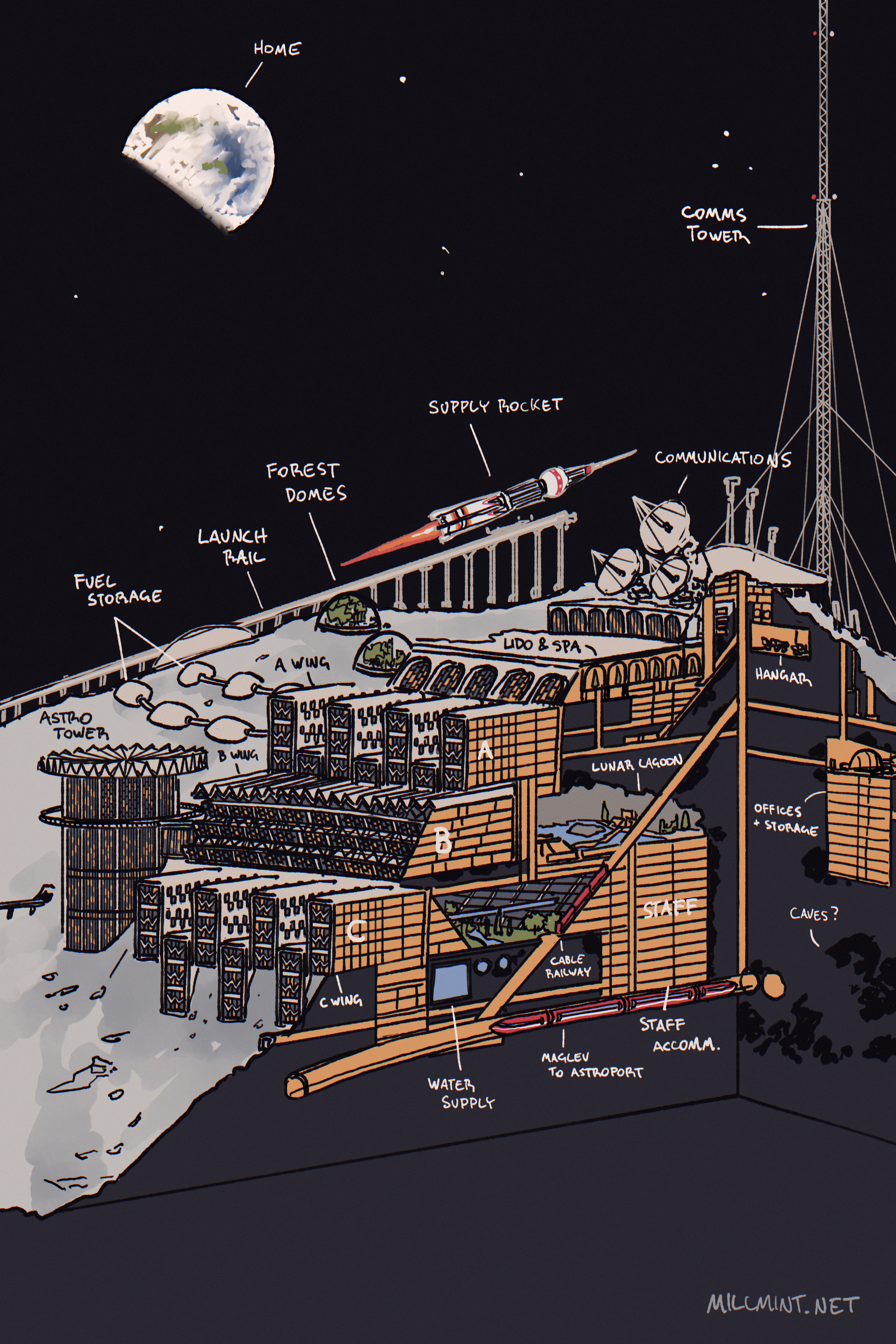 The flight up takes about 24 hours, and the “lunar ticket” gives you 3 nights. Why not go for an spacewalk at Astro Tower, or visit the lido spa that overlooks Nobile crater? The Lunar Hotel is part of Artemis city, which includes research and defence installations.