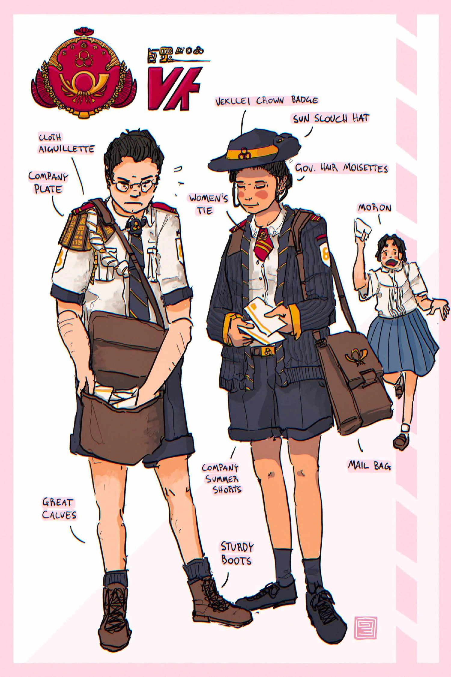 There are not many postal services older than the Royal Vekllei Mail. It is so old that in the Vekllei language its title is simply ‘Mail’ — the ‘Royal’ and ‘Vekllei’ are implied by the use of its hieroglyph. Founded in 1422 as part of the military communications system between government and mercantile government holdings, it has survived various restructurings — and several wars — to remain a critical communications and cultural institution today.