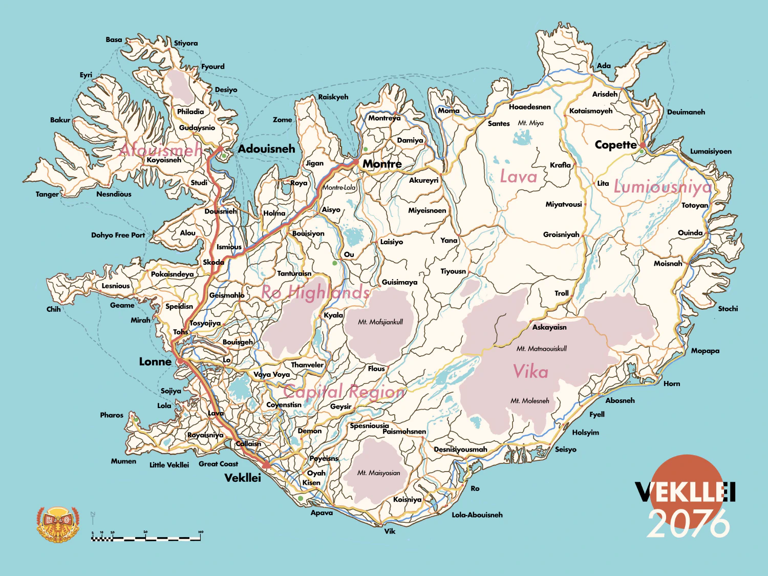 This transit map illustrates all 100 boroughs, Vekllei’s five tallest mountains, its permafrost glaciers and Tzipora’s home in Montre-Lola. Her five largest boroughs — namely Vekllei, Lonne, Adouisneh, Montre and Copette, are highlighted.