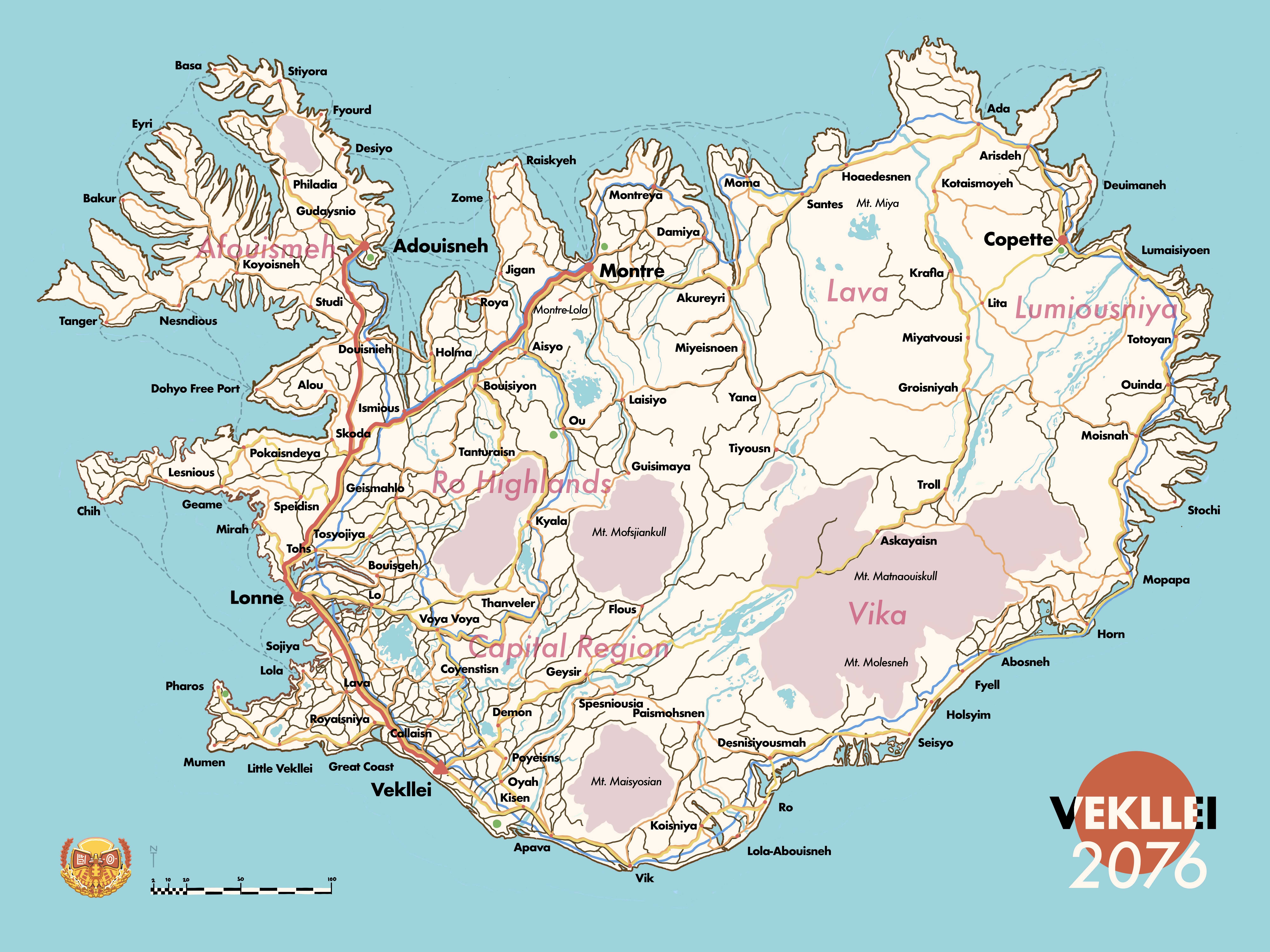 This transit map illustrates all 100 boroughs, Vekllei’s five tallest mountains, its permafrost glaciers and Tzipora’s home in Montre-Lola. Her five largest boroughs — namely Vekllei, Lonne, Adouisneh, Montre and Copette, are highlighted.
