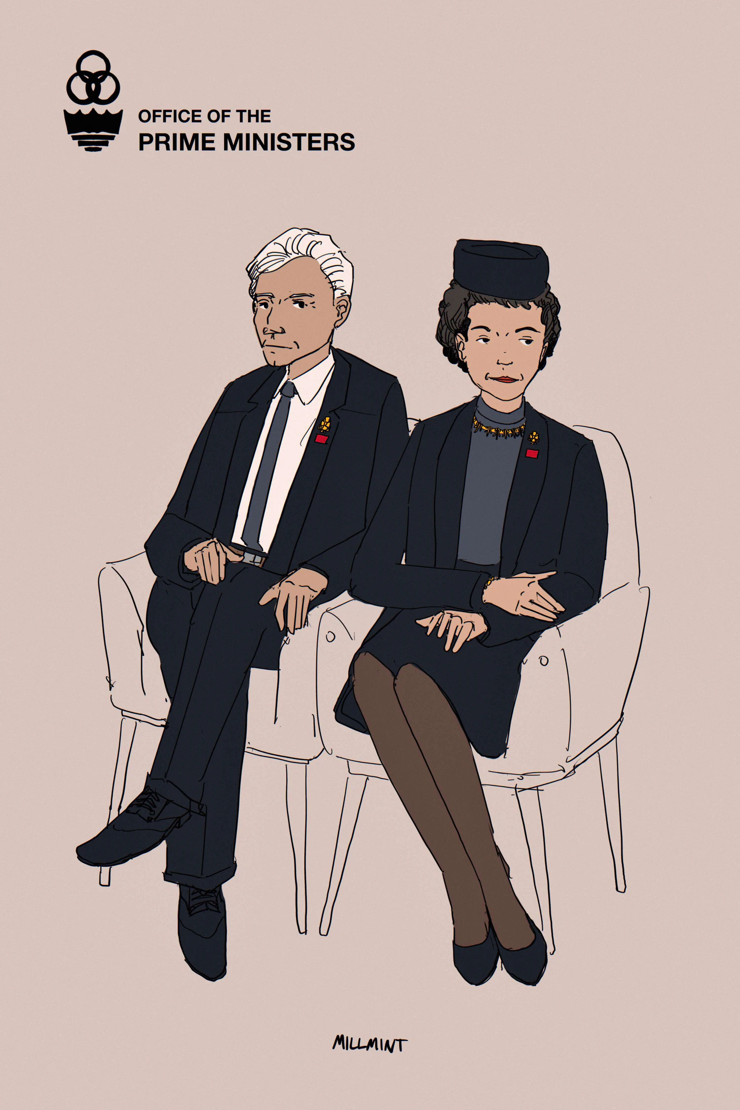 When Tzipora arrives in Vekllei in the early 2060s, the country is lead by Prime Ministers Raif Housk and Dalia Hospotet, pictured here. Traditionally, PMs divide responsibilities along their strengths as politicians. Dalia Hospotet, for example, is a master of statecraft and so meets regularly with foreign leaders to express the Vekllei position. Raif is an economist at the Ministry of Commerce, and his talents lie in exploiting his deep connections to Vekllei business. That is not to suggest the Prime Ministers operate independently – quite the opposite in fact. Decisions have to be made as in agreement, as a single office, and so the relationship of the PMs resembles a married couple, with definitive answers postponed until consort can be had. The election of Prime Ministers is a marriage of two people, in a civic sense.