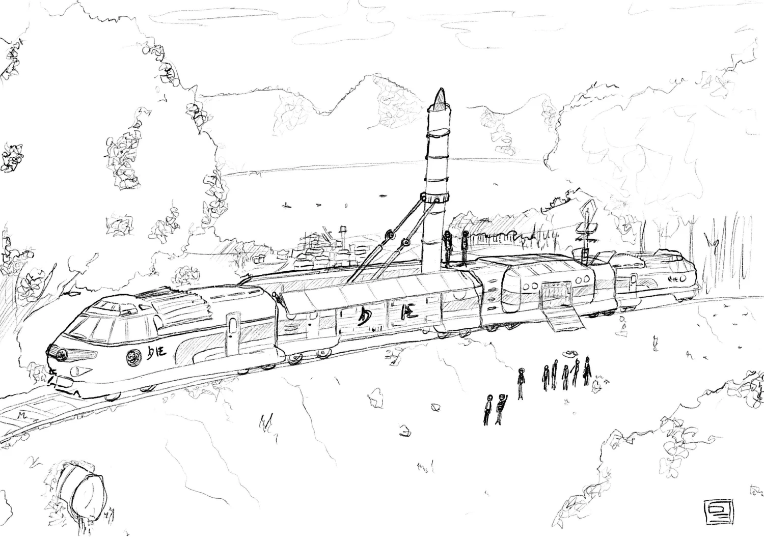 In 2127, the Soviets, U.S., China and Vekllei all employ hidden rail-launched ICBMs as a โdead-handโ that can retaliate after an atomic attack. They rove the countryside of these superpowers, by all appearances regular cargo trains, invisible to spies and spy satellites alike. Rail-mounted ICBMs, and their testing, is one of the more frequently-broken clauses of the latest atomic weapons treaties. It is an unkept secret. This train, โMissile Carriage 2,โ is on its way to the rocketry test facility sixty kilometres away. With two nuclear locomotives attached, the trip will take less than fifteen minutes. Well, at least after lunch is finished.