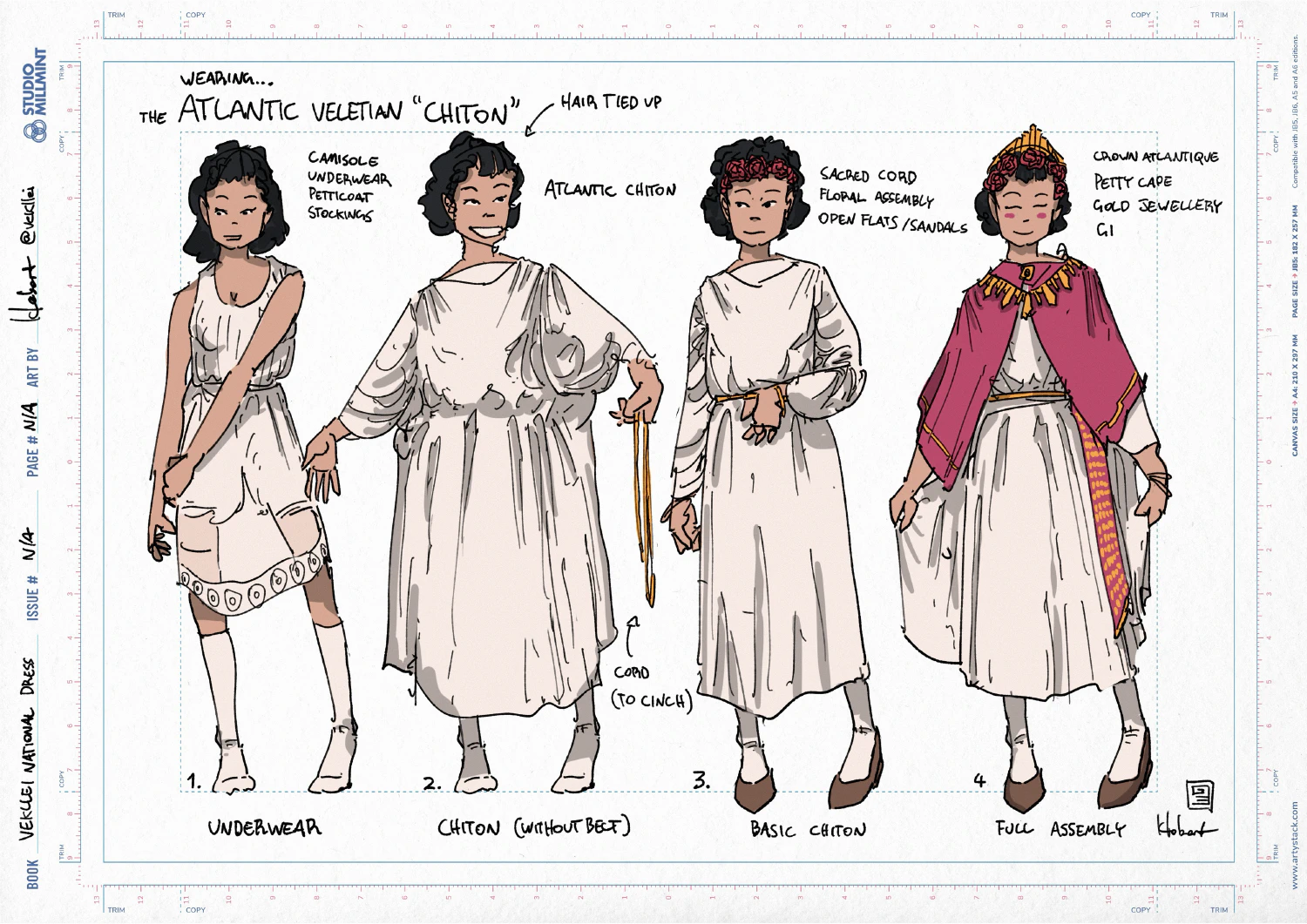 The example above demonstrates Oslola culture, hence the Gi and Petty Cape. In Vekllei’s Caribbean and mid-Atlantic republics, the outfit is modified for climate, shortening the stockings, using lighter materials and dispensing with the cape. The main dress most closely resembles a chiton, a kind of historic garment common in Doric and Ionian Greek history. You’ll see Greek-inspired names, styles and features throughout Vekllei, which might imply a grandiose national self-identity, but is more likely a means of avoiding emphasis of any one culture within the diverse country.