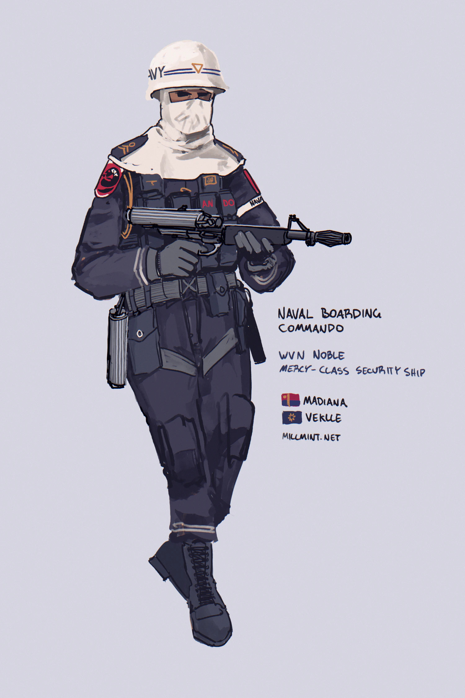 Most large ships have security teams, but only commandos are trained in boarding, which can involve hair-raising stunts out at sea. In combat they always wear anti-flash gear, nicknamed “white hoods,” and carry signature carbines equipped with 100-round helical magazines.