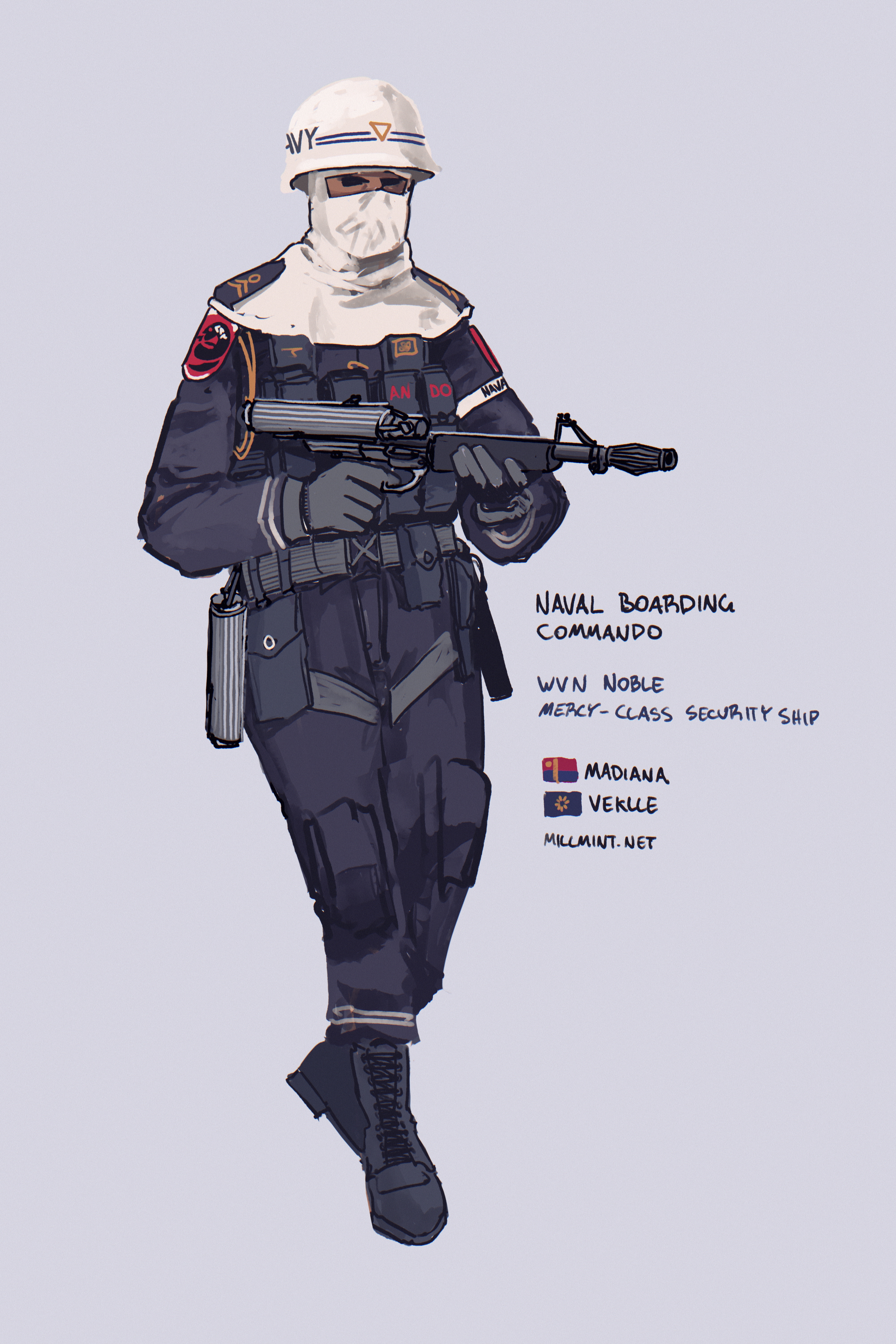 The WVN Noble is the Mercy-class security ship depicted here in the previous Common Navy drawing. It carries an assault group of naval commandos comprising five detachments or about 50 men.