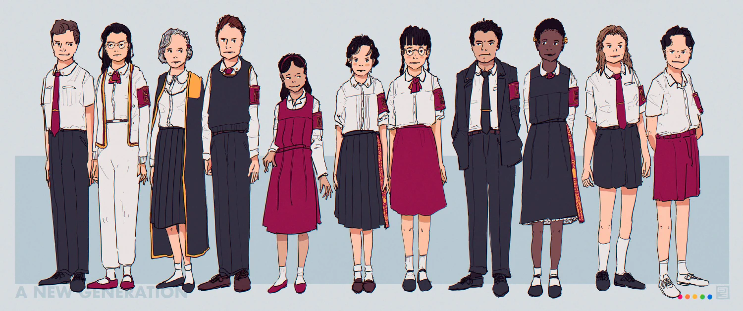 Depicted here are the good-natured youth of the new generation in school uniform — a topic we’ve visited before. All students in Vekllei wear the same uniform, including at university. The uniforms themselves are not designed specifically to regulate appearance — and to this end, schools do not have dress codes regarding hair or cultural/religious accessories including jewellery.