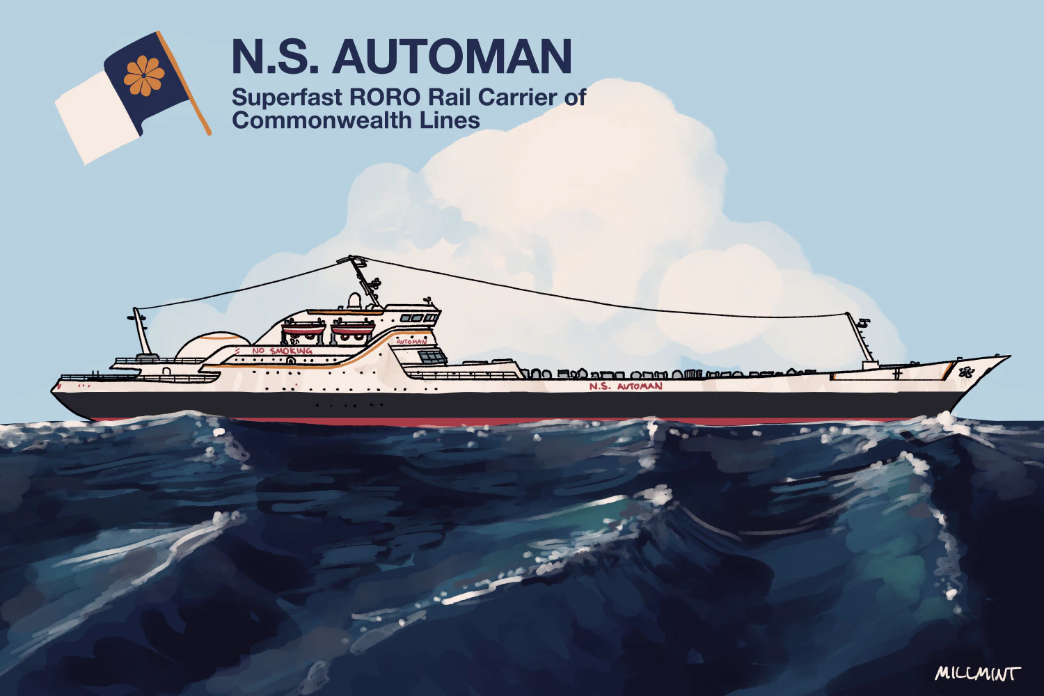 Rather than containers, ships like the N.S. Automan carry modular, palletised railcars that simply roll on and off. These nuclear cargo ships are very fast, and common throughout the Vekllei Lesser Antilles. They facilitate rapid industrial freight, since cargo never leaves the railcar it departed on.