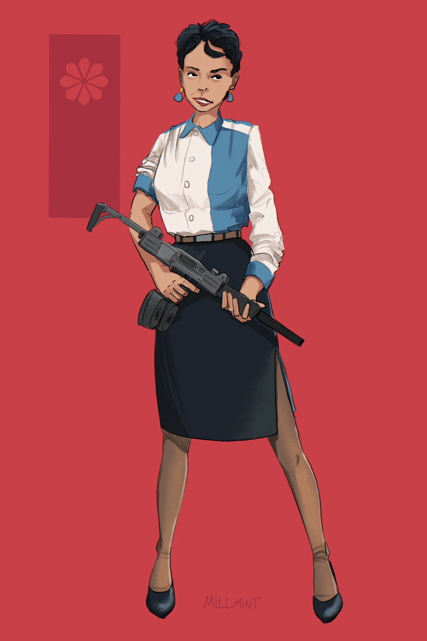 Although her weapon is obviously inspired by the uzi, it’s actually a domestic Vekllei model descended from what the original uzi license. In this setting, both Vekllei and Israel (along with many others) are part of the non-aligned movement, and so a lot of trade flows between its members.