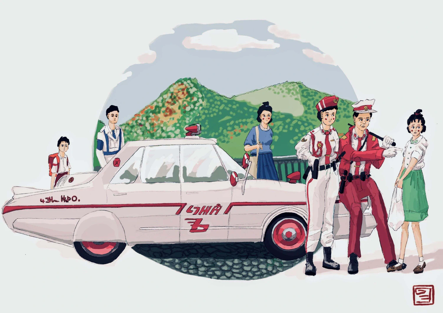 In the picture above we see professional cops, or copa, watching a suspect from across the street. We can tell they are professional officers because they wear red and white uniforms, instead of the navy, red and white of beat cops. The woman is a firearm officer, and carries a revolver in her holster. The man is not armed but carries a baton on his shoulder.