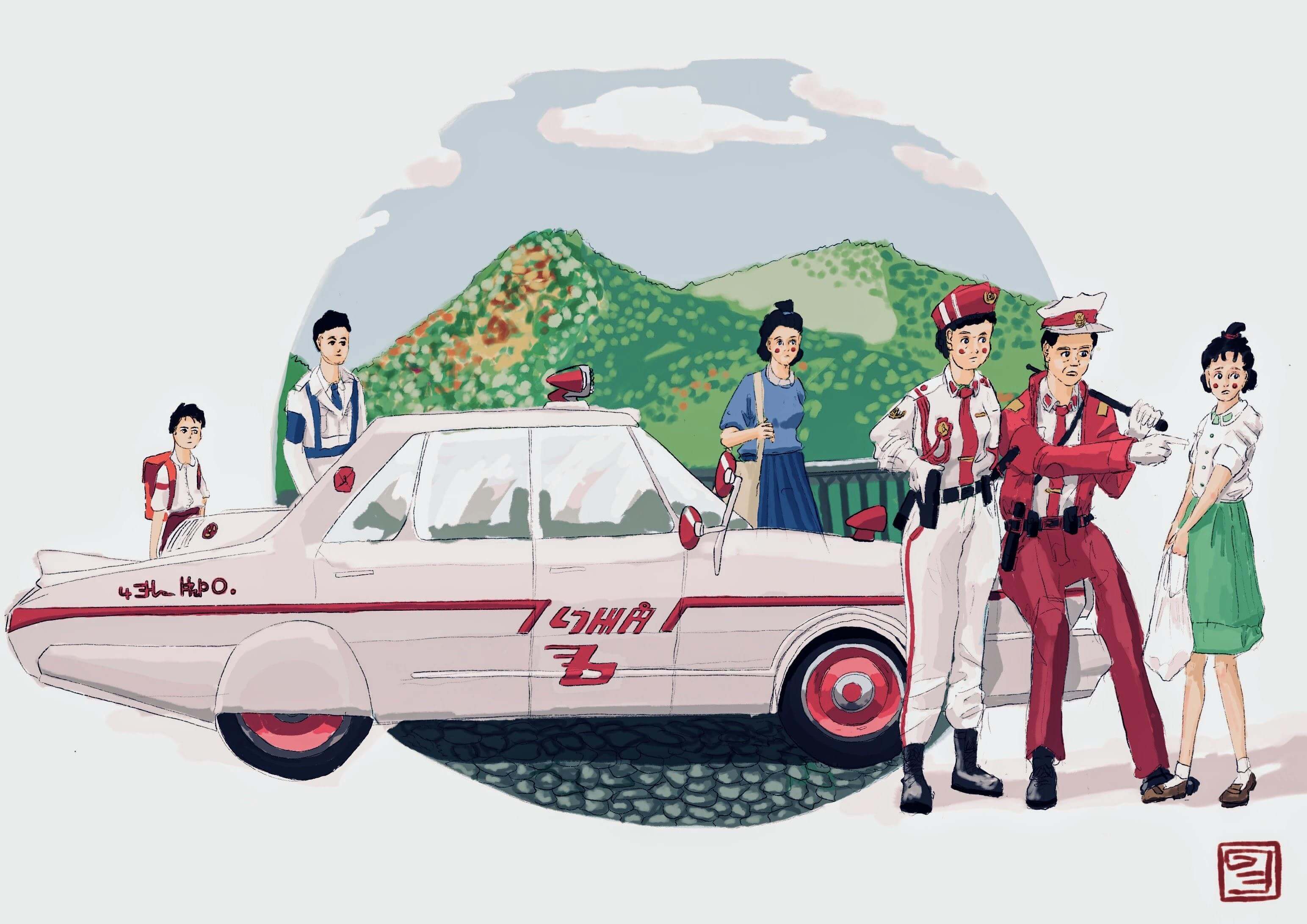 The police car, a Model 10 (Special), sits low to the ground, weighed with a 60MWe Molten Salt Reactor where we’d usually find the trunk. The car has a theoretical top speed of 400km/h, but will never reach anywhere close to that — pursuits are extremely rare in the country, as almost no-one has a personal automobile. On its roof it carries two cherry lights and a single Dura wailer siren. The service number, 6, tells us that the unit is from the Montre region.