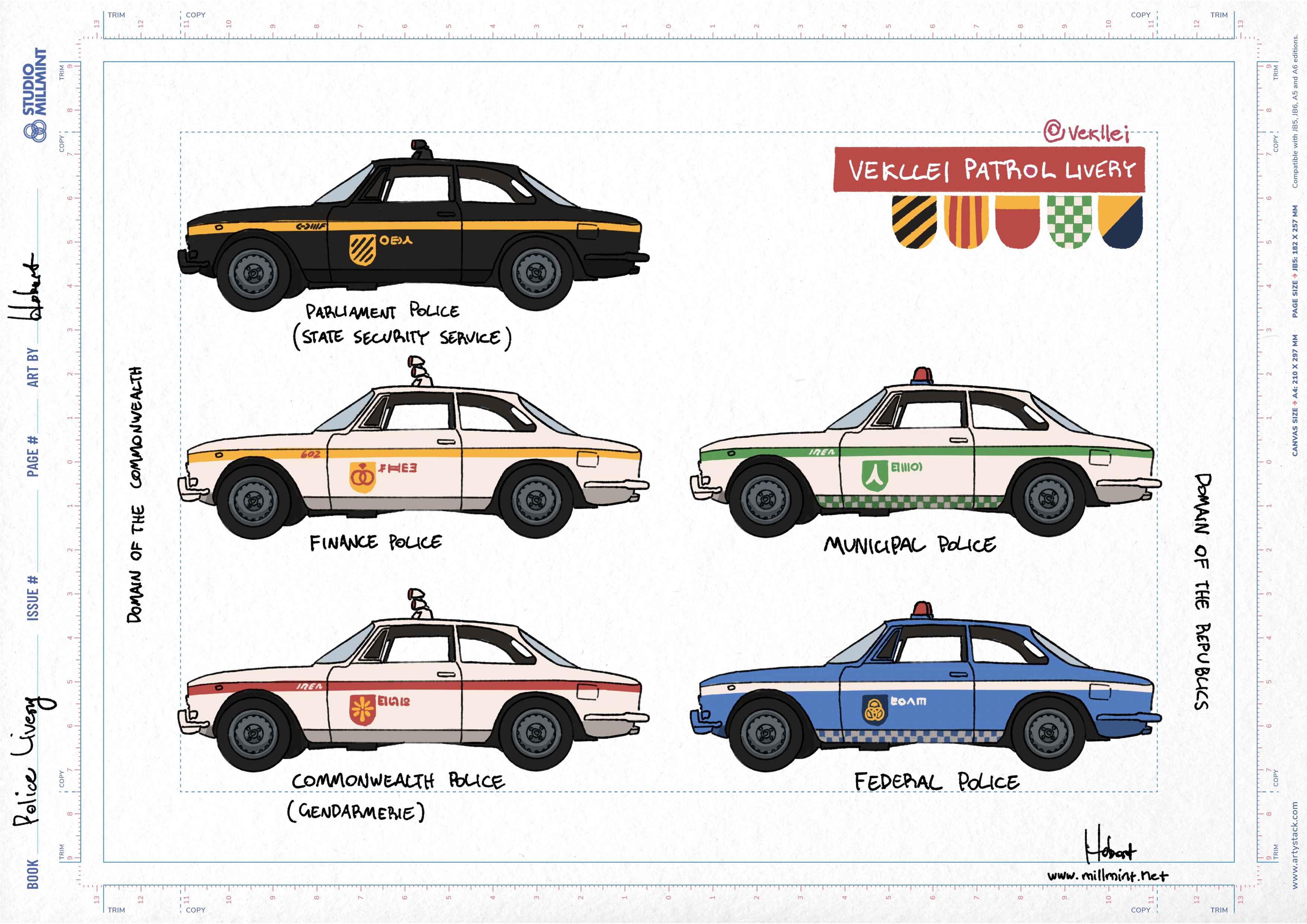 Vekllei is of course a federalised Commonwealth, and so it has different kinds of policing for different kinds of laws. The array of cars on the left have jurisdiction related to the Commonwealth (smuggling, financial crime, mint security, intelligence liaisons, protection, etc.) and the cars on the right are administered by its republics (local law enforcement and regional policing).