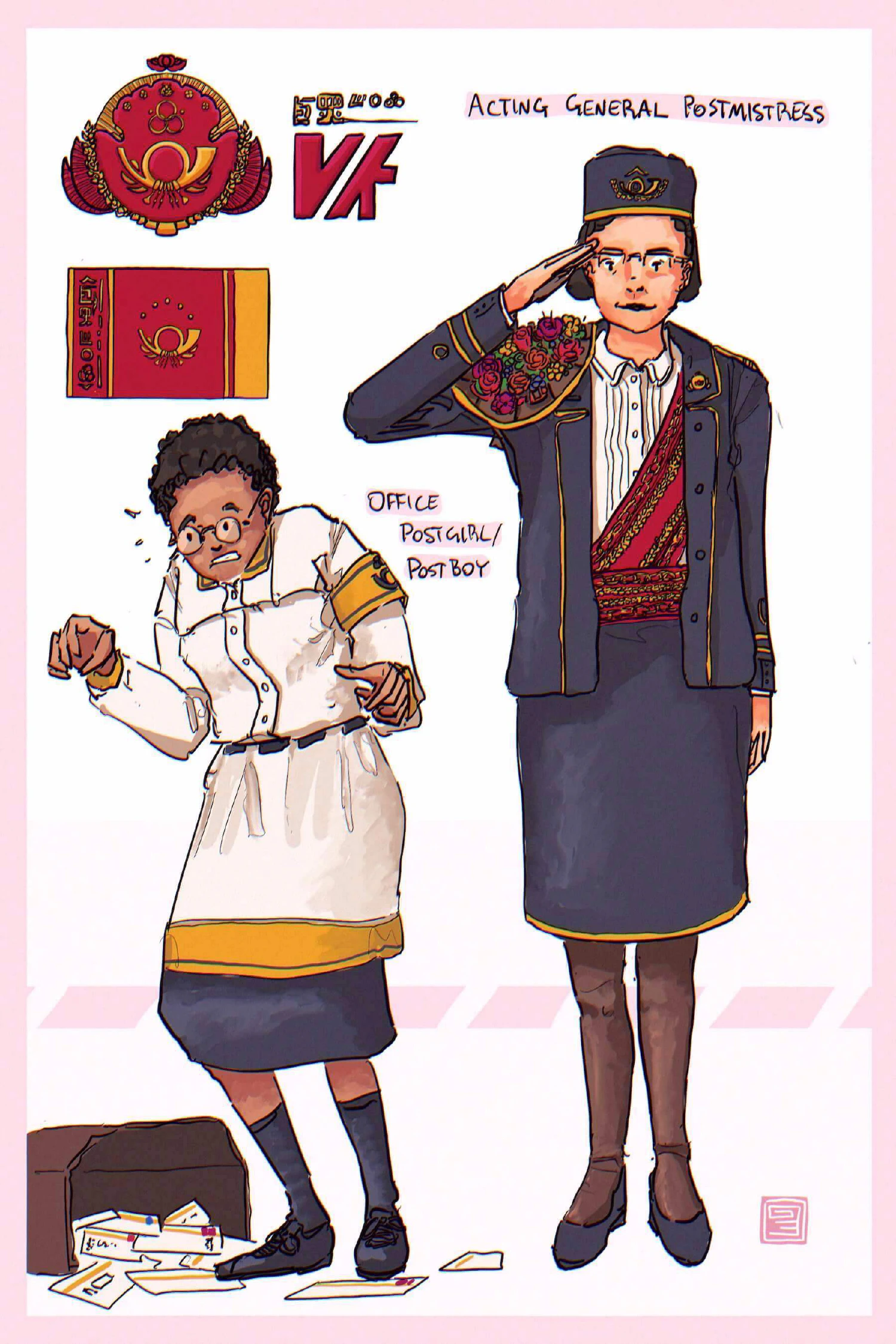 Here we have arranged the highest-ranking and lowest-ranking members of the Royal Vekllei Mail (Mail A.r.). On the left is an Office Postgirl, a precursory position tasked with distributing letters in the sprawling bureau complexes abundant in the centralised postwar period. This particular employee is Aleja Hernández, who has decided she’d rather deliver mail than spend another year studying for high school exit exams. Mail runs in her blood — her father, a Dominican, is stationed abroad in service of the Royal Mail’s Cuba Office with her mother, a native of the country. They’ll be abroad until the Spring, and by the time they get back they expect Aleja to have found full-time work with the Mail. She wears a baggy smock to keep ink and dirt off her uniform. Here, she represents a common intern of the organisation, tasked with menial and uninteresting work for a few weeks as she’s trained to be a proper Postwoman.