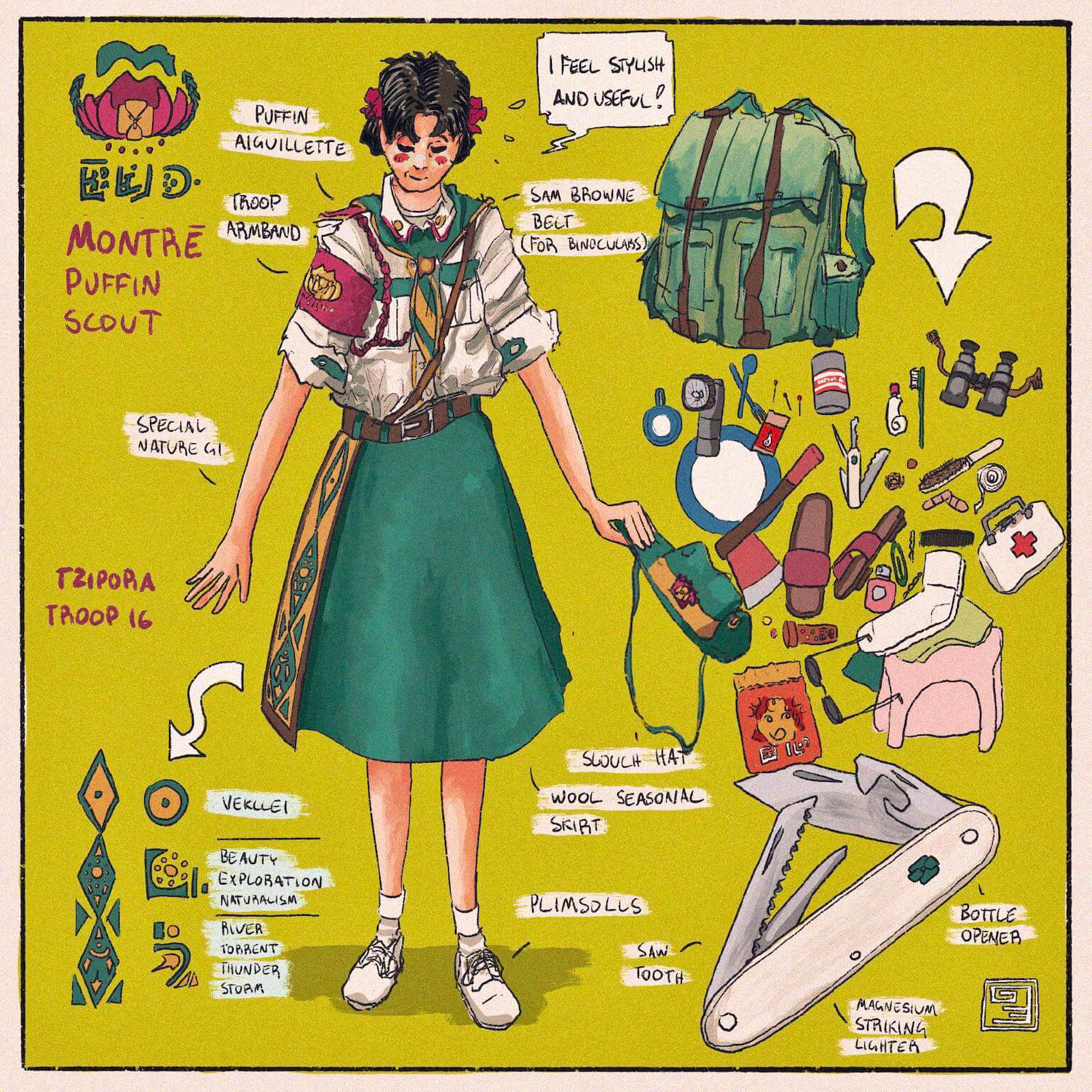 In the picture above, you’ll notice a guide to decoding a simple Vekllei Gi, a type of ceremonial quarter-pleat, and a collection of items a Puffin Scout is likely to have on their person.