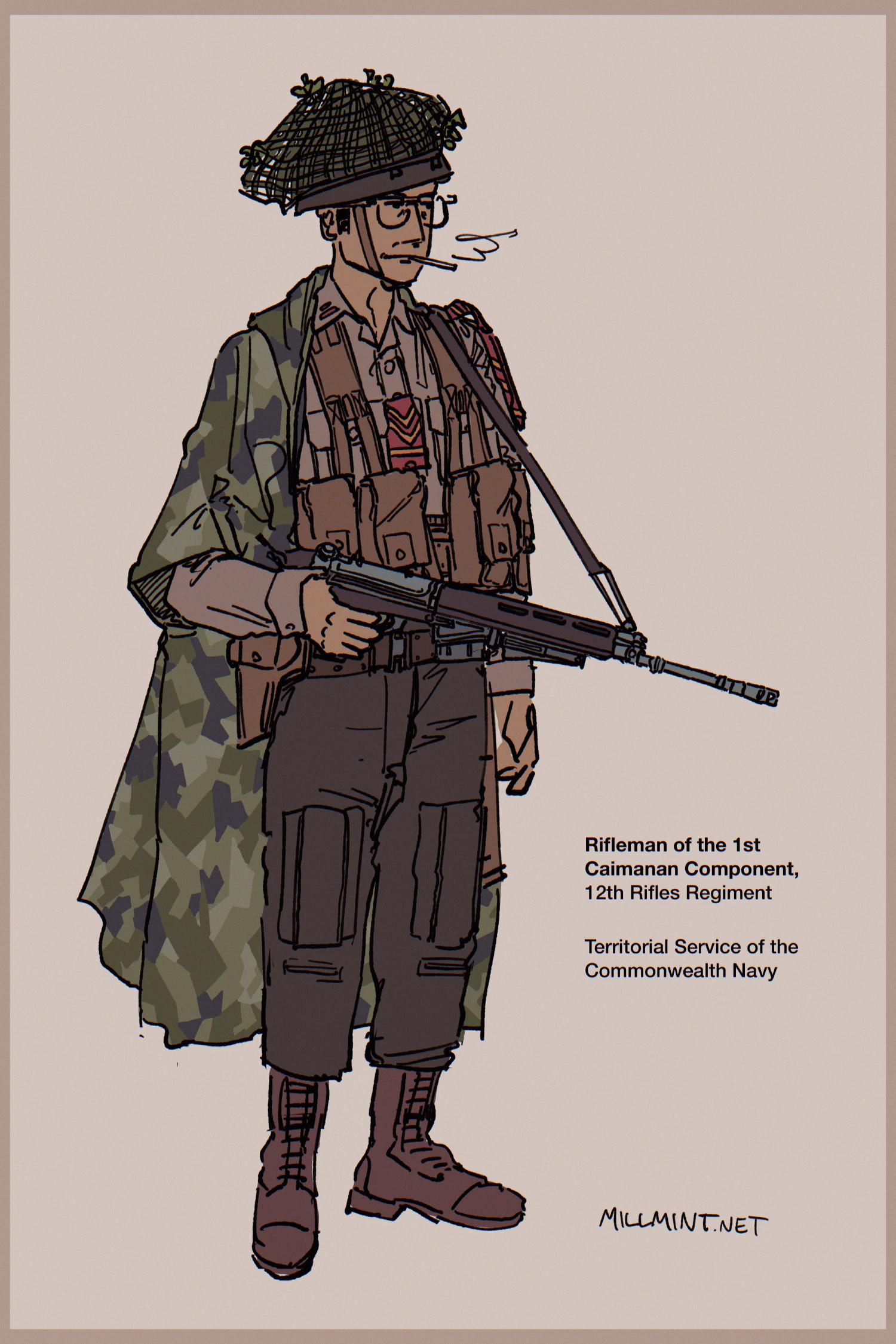 MillMint -millmint 📔 Intro 📓 Factbook 📕 MillMint 📗 Stories > > > > NEW 📗Story: Police Armoured Car ❌ Rifleman Sunday, Oct 27, 2024 Home Stories MillMint Rifleman of the [[territorial|Territorial Services]], feat. [[Vekllei]] camo poncho & mitznefet.