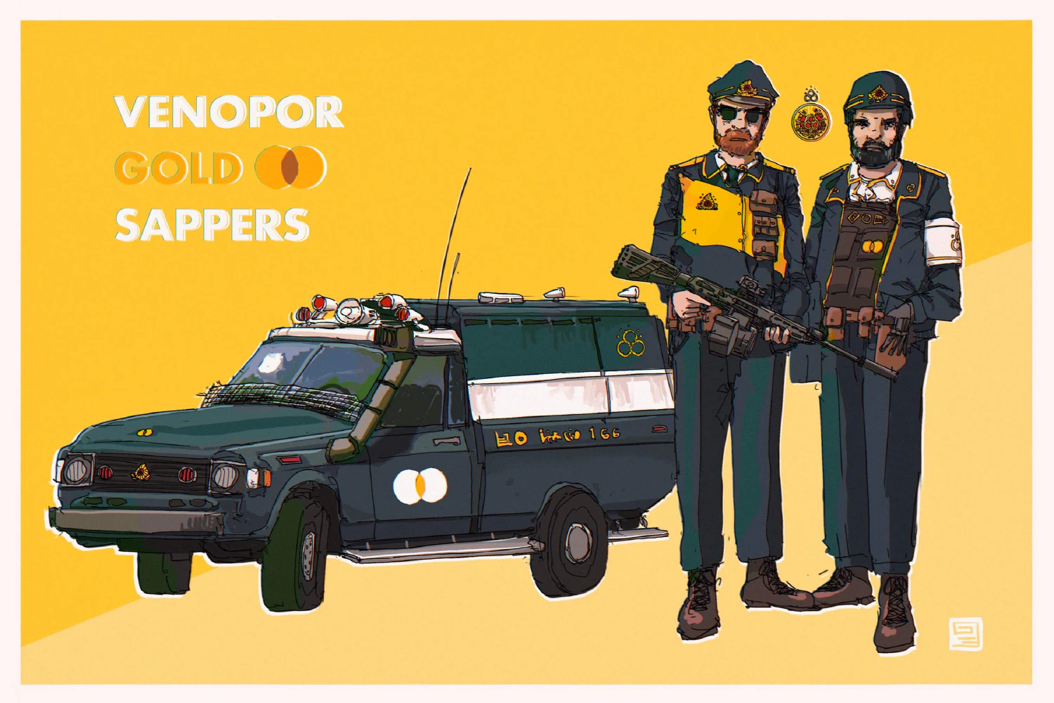 Still, the Venopor Gold Sappers retain the beards of their ancestral units, and preserve parts of their heritage through their ceremonial parade dress and traditional songs. In this image we can see illustrated two Sappers in both civilian and paramilitary dress. The redhead holds a submachine gun equipped with drum magazines, which are unusual but commonly used in security units to achieve initial fire superiority and suppress, which allows for repositioning and backup in convoy environments.