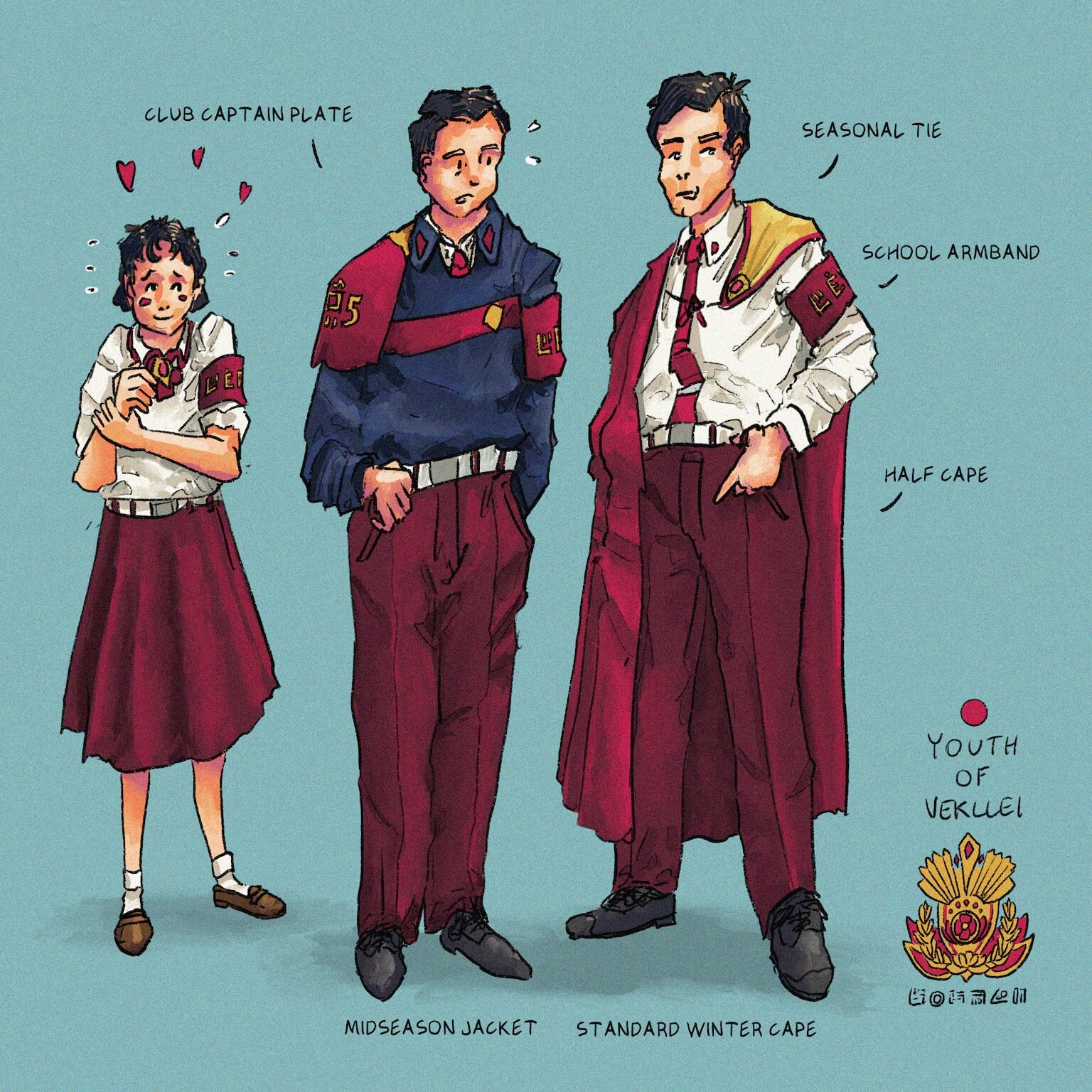 Visible here are the standard armbands universal to Vekllei life, a male tie (although only male in an education context, and is often appropriated by rebellious young women), and a captain’s plate to distinguish certain older students as club leaders, which are integral parts of the Vekllei schooling experience. Clubs operate independently of the school and often assist students in honing their expertise for higher education.