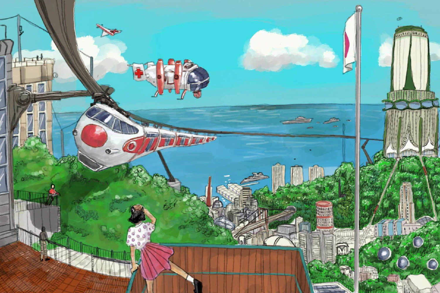 The Lola monorail carries tourists and workers between the district centre and the World Expo Tower. A medihelijet buzzes the top of the hill, circling for a place to land. In the distance a supersonic jet roars off to New York. Itβs a great time to be alive. Anchored far from the harbour is an enormous nuclear aircraft carrier. From the top of the hill you can see jets jump off and return to the deck like bees in the spring. Itβs training season and the air force cadets are piloting jump-jets.