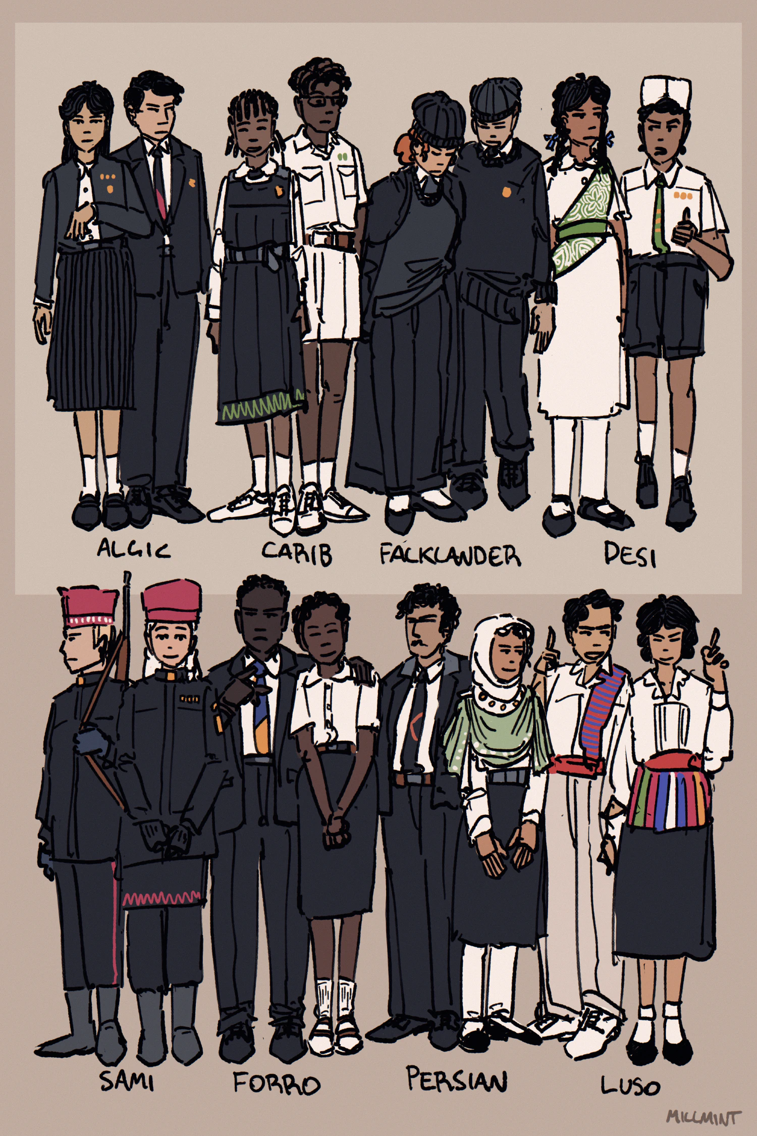 These are good examples of how the basic elements of the student uniform, which is established at the federal level, is adapted by municipal schools for the climate and culture. You can see this practice throughout Vekllei, and reflects their attitudes towards federalism and localist subsidiarity.