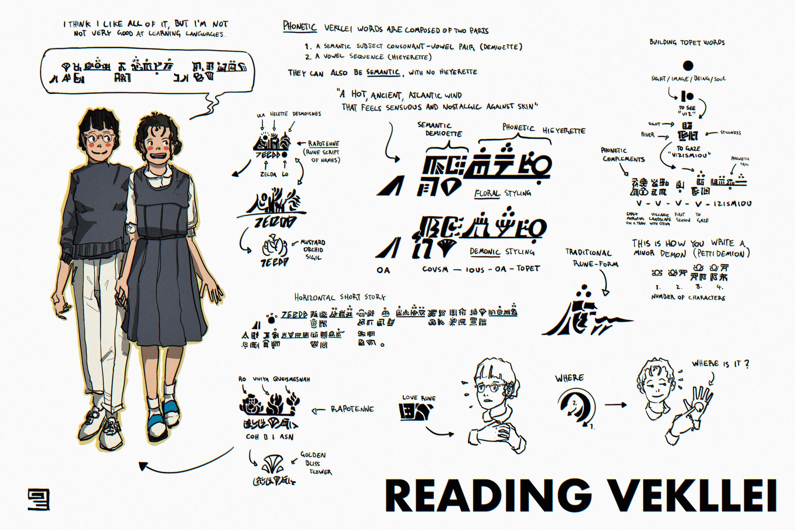 The above article covers the language conceptually in pretty much all the detail you’d ever want. So, despite the heavy use of labels and text, this picture is particularly concerned with the literal appearance and structure of the Vekllei written language, called Topet.
