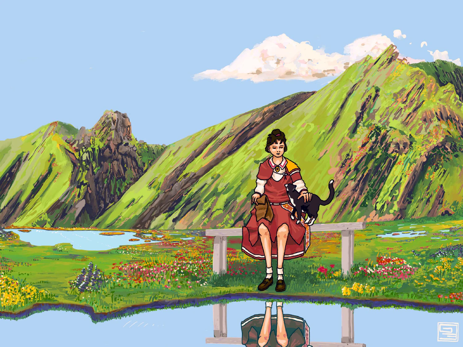 In the mountains south of Montre, near the village where she had worked as a librarian for some years, there lies a healthy plateau between monumental basalt ribs. Here is the grave of her mother, long since turned to ashes and returned to the earth. This whole ro, this flower-tundra, was alive with spirits. The ro are important to Vekllei people as the meeting points between life and death. Her mother appears as a cat she recognised from the train station, and the two of them share a space for a while. Zelda never knew her mother all that well, and disliked her for some of the things she did, but eighty years does a lot to the turbulence of grudges and these days she wonders more and more about the bloodline from whence she came and, perhaps some day, she might return.