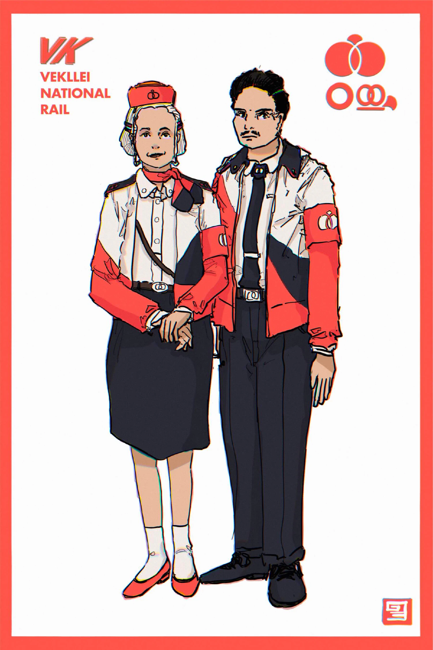 The people illustrated here are VNR Attendants, professional people-pushers and friends of the rail-travelling public, who work on trains and platforms guiding, managing and assisting people. In Vekllei, most public-facing work is performed by the elderly, conscripted or socially-inclined. Although VNR has existed since independence, and is more or less the ancestor of the prewar Junta rail monopoly in floral-period makeup, its uniforms were overhauled in celebration of “250 years of rail” in 2055. Their jackets display Vekllei’s optimism in the future of plastic-based fabrics in fashion.