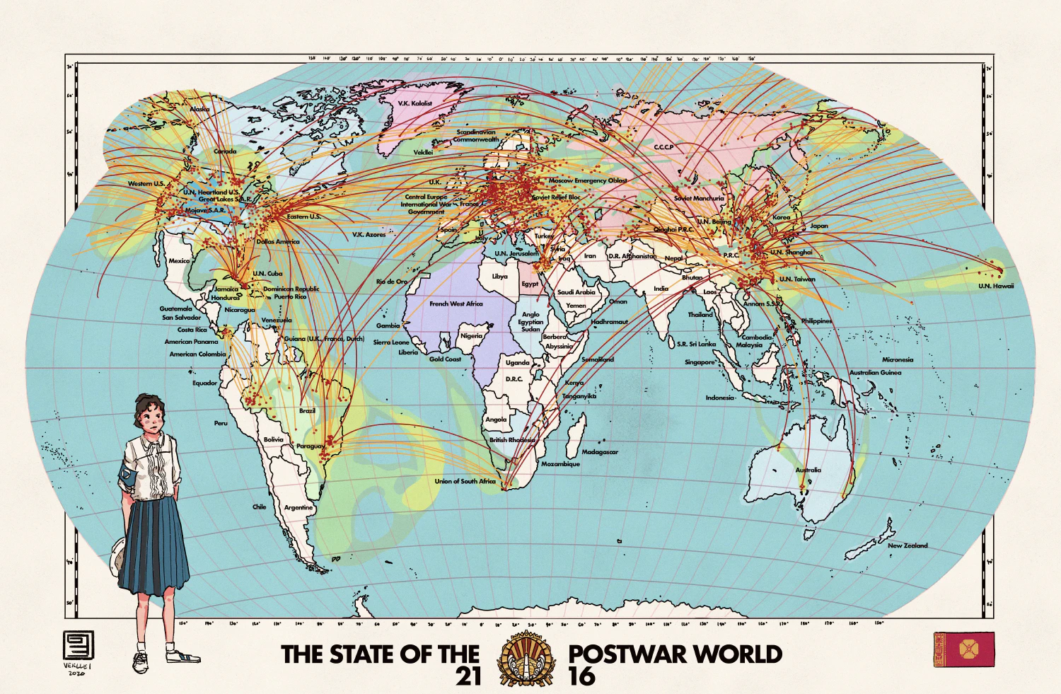 This political map marks the territories of Earth as they stand five years on, in 2116. There are fewer countries in the world today than in any other point in human history, in part because the catastrophic reduction in human population — some 520-600 millions in the first year — has emptied out countries and rendered others uninhabitable. Many of these territories here are disputed and, in some cases, autonomous — for simplicity, they are presented as they are recognised by the U.N. The map also presents a long-exposure view of the war as it happened, and its remaining fallout currents today. Red dots mark significant nuclear detonations on August 14th. Yellow dots mark surface warfare in some capacity. Red trails mark missile flight, reduced in number here by strict denuclearisation treaties of the decades previous. Yellow trails mark the flight paths of atomic bombers, both supersonic and subsonic. This map does not record failed launches, intercepted missiles or downed aircraft.