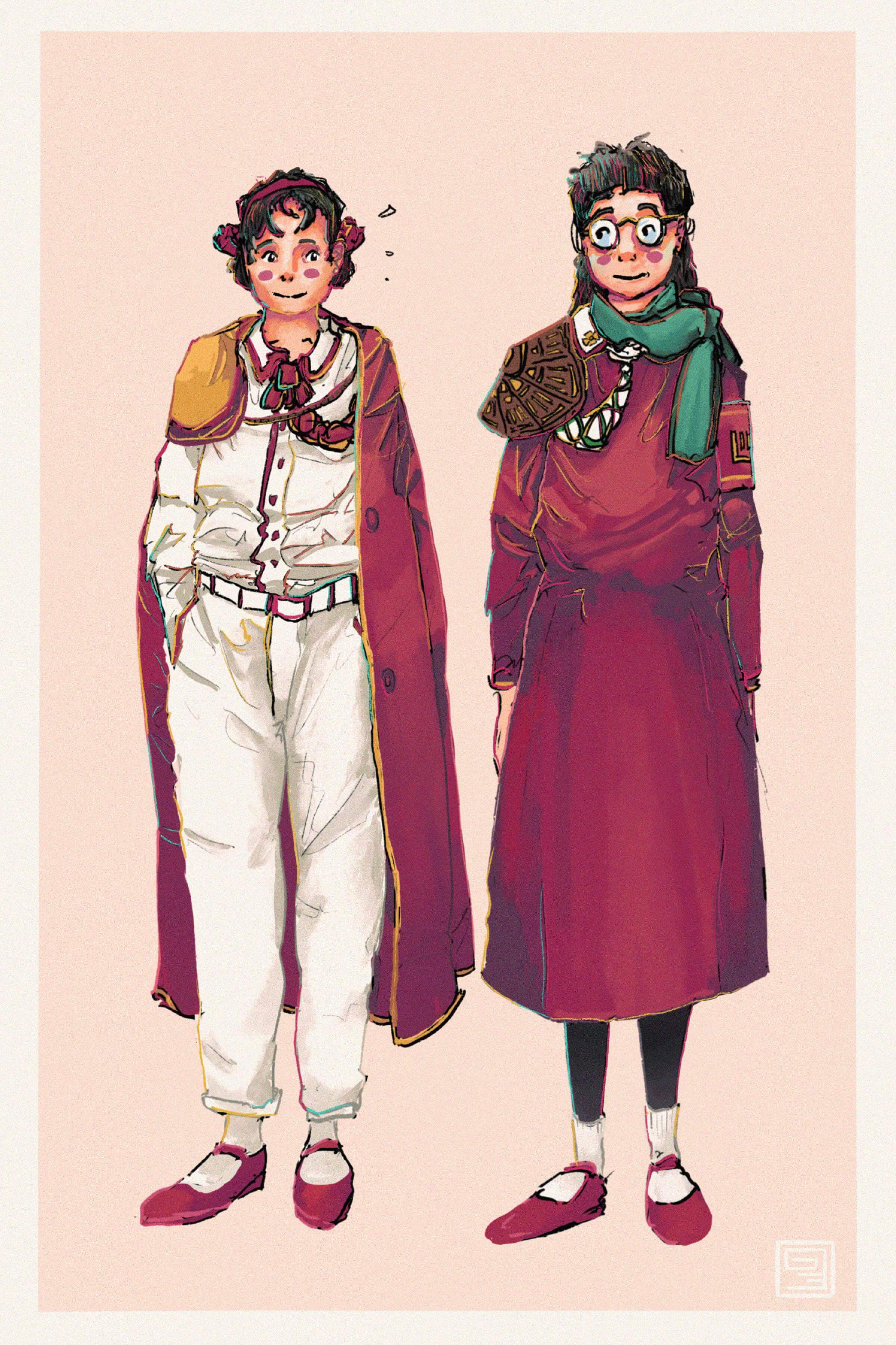 Although school hours are reduced in winter, life carries on and Vekllei fashion becomes traditionally utilitarian. Tzipora has poor circulation and cold hands even in the warm months, and by November she’s traded the skirt and gi for traditional rouisha trousers and a cloak. Rouisha, like a lot of traditional clothing, have origins in agriculture and are characterised by a loose, baggy fit and insulated lining. Cobian is wearing a heavy wool sack-type dress, which is worn like an apron over other clothing. Winter brings forth “petticoat society” literally. Note the leather plate on her shoulder, to which her christmas aiguillette is attached.